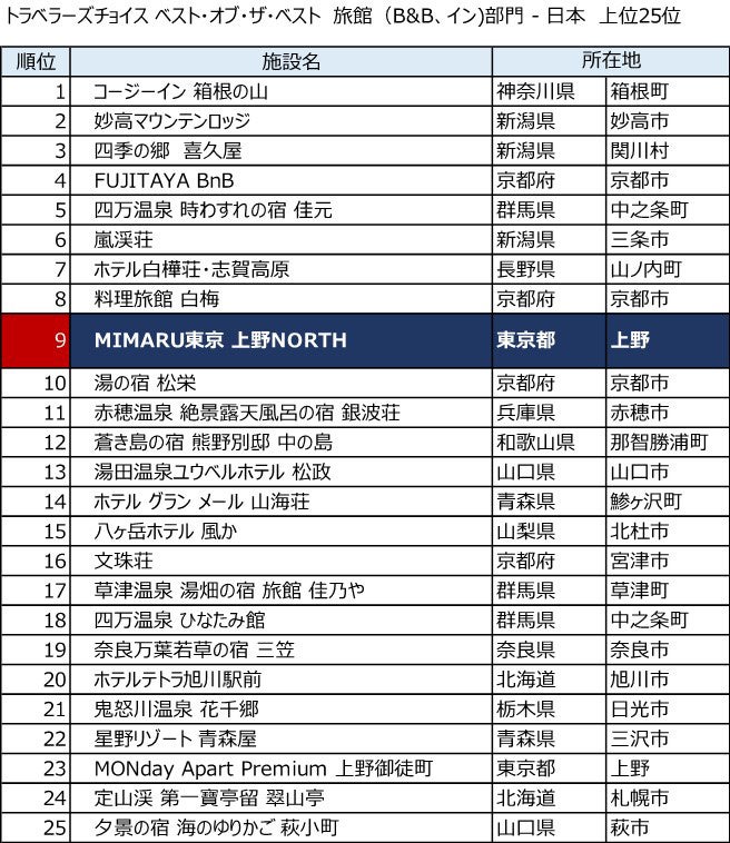 「2023 トラベラーズチョイス ベスト・オブ・ザ・ベスト ホテル」『MIMARU東京 上野NORTH』 旅館(B&B、イン)部門 日本9位に選出(ニュースリリース)