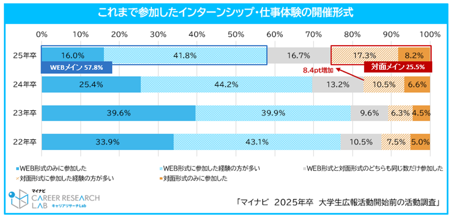 であることはこれまでも報告してきましたが、経年でみてもこれまで以上に高い割合となりました。25年卒はインターンシップの定義改正があり、例年に比べて学生の関心も高く、その分前年よりも就職活動の準備が進んでいるように感じます。3月1日から、本格的に就職活動が開始され、企業側から選考結果の通知が届くと、準備状況に関わらず予想していなかった結果になることがあるかもしれません。毎年お伝えしていることですが、内々定は「早く」獲得することに意義があるものではありません。入社できる企業は1社だけなので、これまでしっかり準備してきた自分を信じて、自分にあう1社を見つけていただきたいと思います。