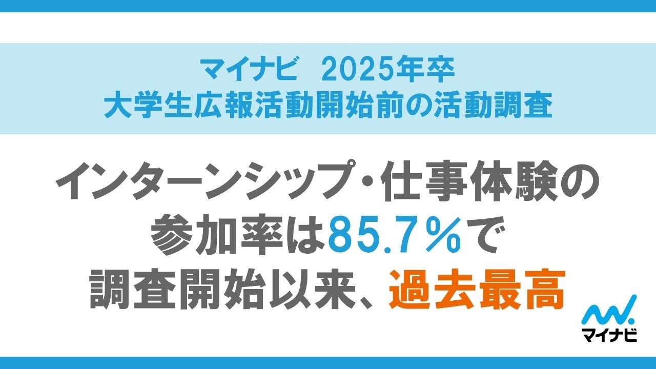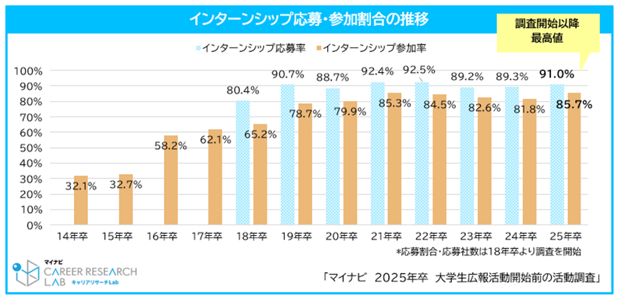 インターンシップ・仕事体験の参加率は85.7%で14年卒の調査開始以来、過去最高