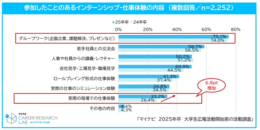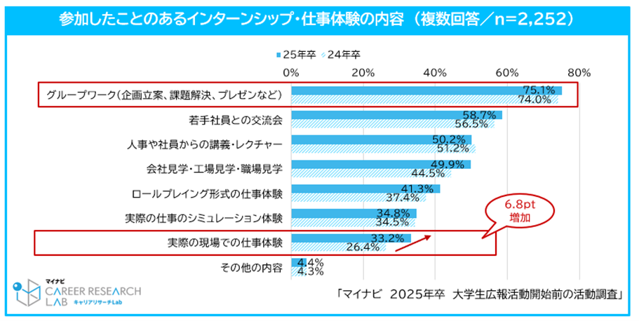参加したプログラムの内容は「実際の現場での仕事体験(33.2%)」が前年から最も増加