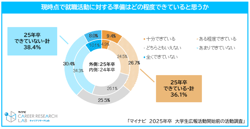 就職活動の準備が「できている」と思う学生が前年から増加し36.1%だが、