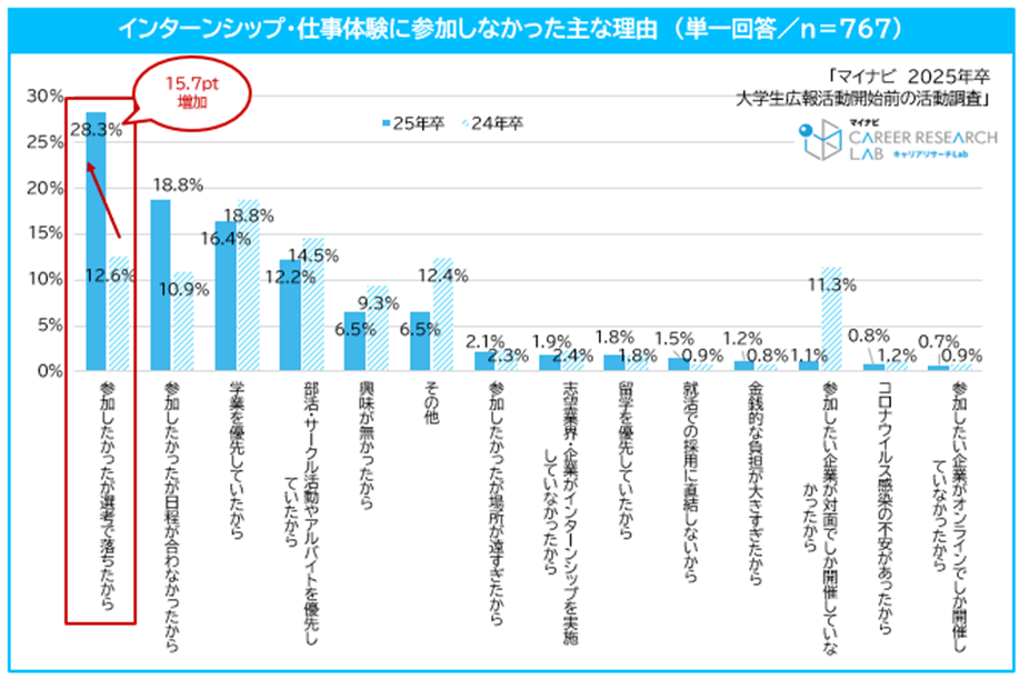 インターンシップ・仕事体験に参加しなかった理由は「参加したかったが選考で落ちたから」が最多の28.3%