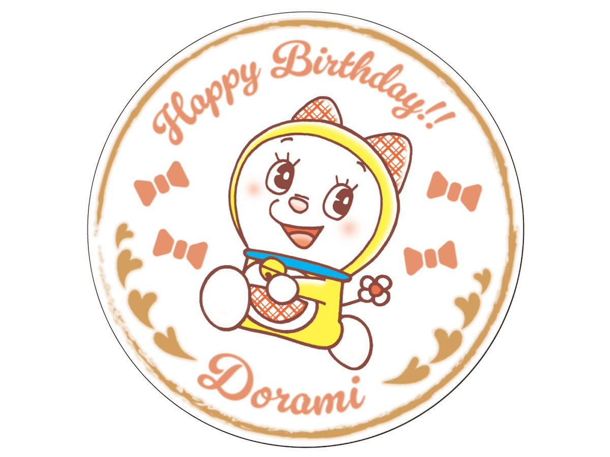 ドラミの大好物「メロンパン」と、赤いリボンやお花のしっぽがチャーミングな、かわいさいっぱいのバースデープレートです。