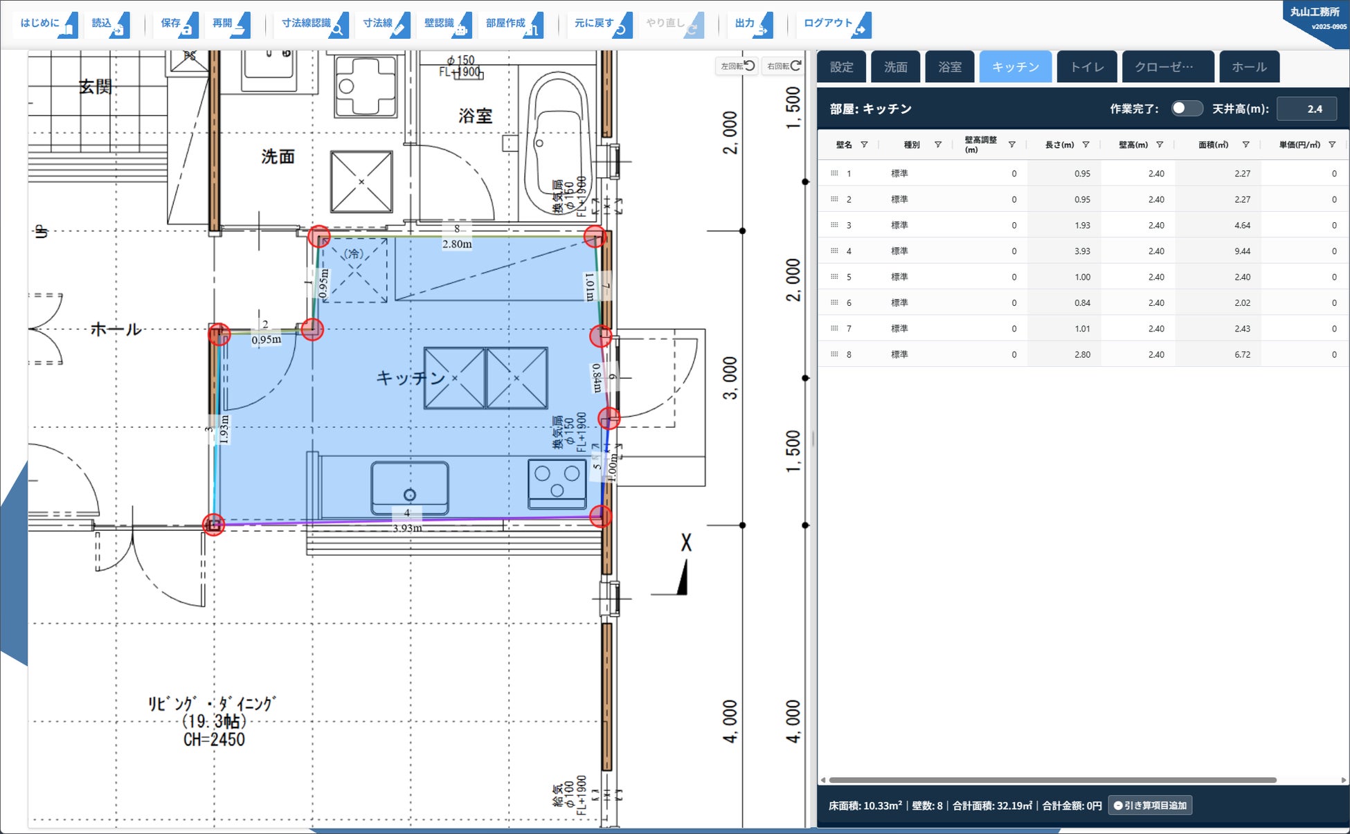 さらに、壁高や単価などを入力すれば数量計算が自動反映され、CSV形式で出力できるため、積算・見積作成・材料発注などの実務フローにそのまま組み込むことが可能です。なお、本技術は建築図面に限らず、土木工事における複雑形状の算定にも対応可能で、高さ情報を加えることで体積算出まで拡張できる汎用性を備えています。