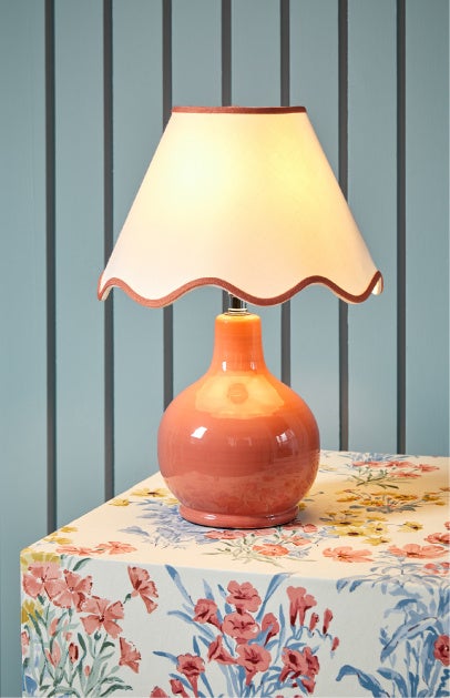 鮮やかな釉薬色が空間のアクセントに。布シェードから広がるやわらかな光が、ベッドサイドやデスクなど多彩なシーンを上品に彩ります。