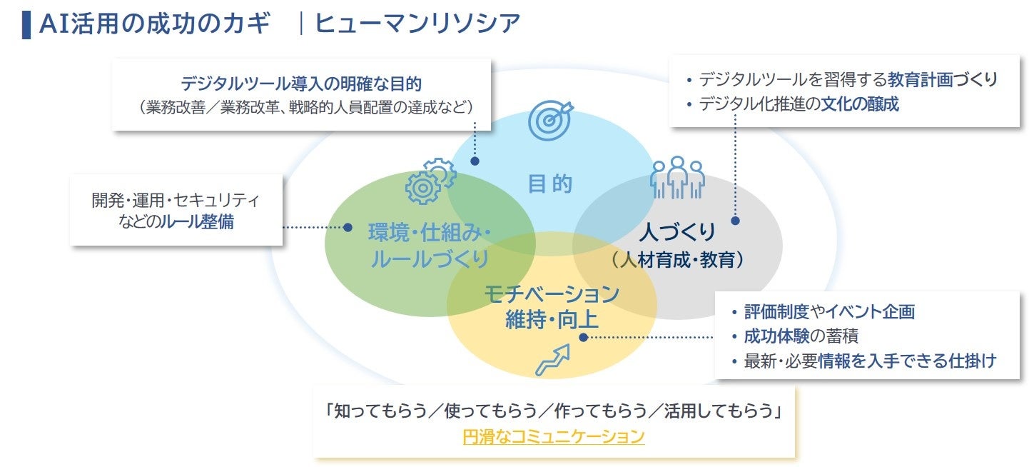 当社では、AIをはじめとしたデジタルツール導入において、「目的の明確化」、「人づくり」、「環境づくり」、「モチベーション維持」の4つの要素が重要であると考え、包括的な支援を行っています。「つなぎAI」の販売・導入支援においても、研修による人材育成およびエンジニアによるサポートなどのサービスラインアップを順次拡充していく計画です。