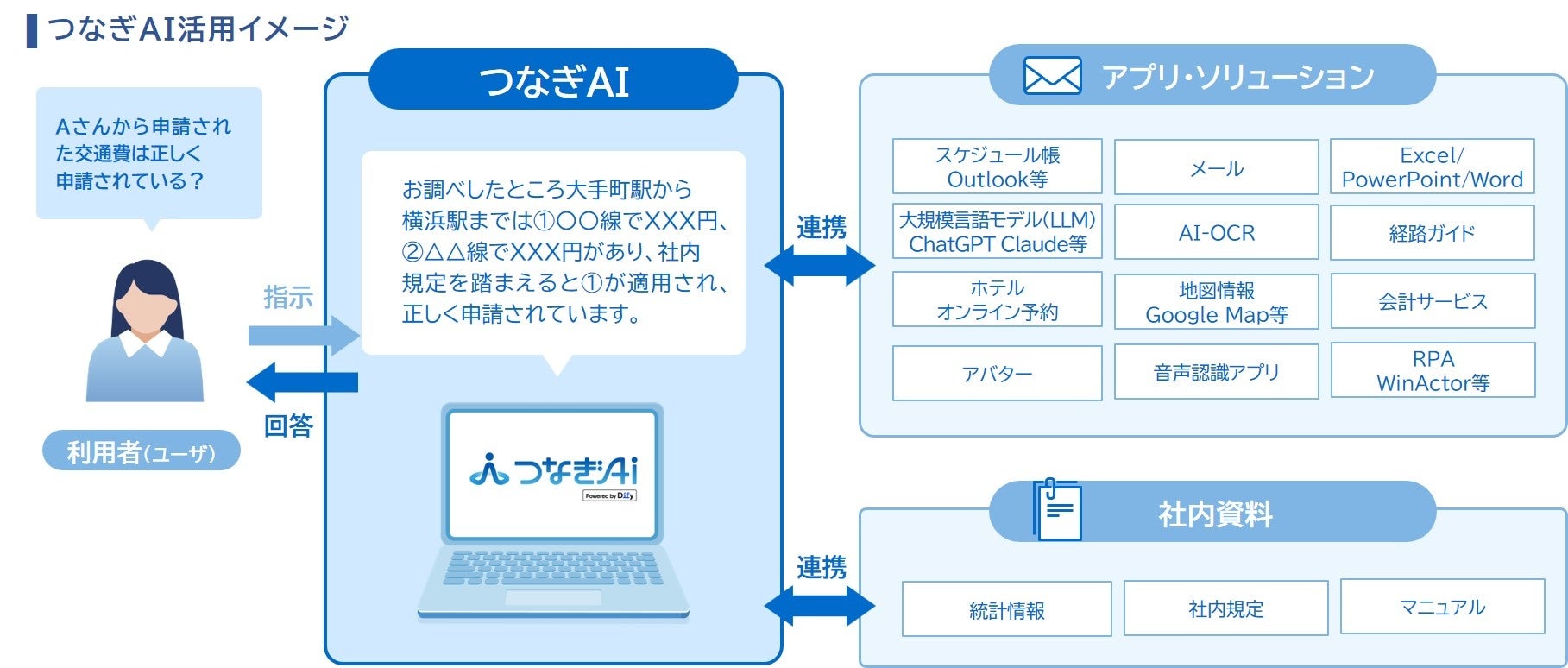 このような背景を受け、NTTデータが提供するAIエージェント開発基盤で、非エンジニア社員が、IT部門に頼らず、業務に即した生成AI活用の業務アプリを開発できる「つなぎAI」の販売を開始します。当社はこれまで、現場に寄り添い、伴走しながら、RPAをはじめとしたDX活用による業務自動化を支援してきました。新たに提供する「つなぎAI」を活用することで、現場主導の業務改善を、より一層推進できると考えています。