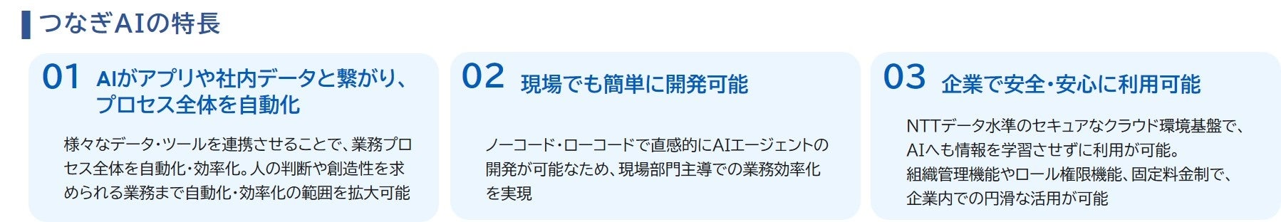 ●NTTデータが提供するAIエージェント基盤サービス「つなぎAI」の販売を開始