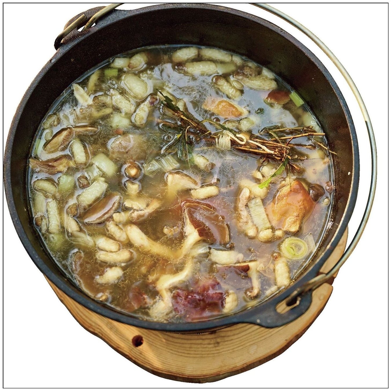 その旨味成分のトリガーとなるのが、脂。「今回は熊肉の脂を入れてワイルドさを出し、香ばしさが出る長ネギや滋味にあふれるゴボウも、きのことの相性は最高です」。最後にクロモジを入れ、木の香りをスープに沁み込ませれば、雲南きのこスープの完成だ。