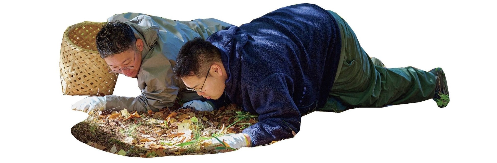たくさんの落ち葉で埋もれた地面のなかから、小さなきのこを探すのはカンタンじゃない。上から見下ろすだけでは見えてこないし、気づかずに踏み潰してしまうこともある。そこで茸本さん直伝の必殺技“ワニポーズ“になって、目線をきのこと同じ高さまで下げてみる。すると、地面から顔を出すハナイグチを発見。さら森を深く入っていくと、10種類以上のきのこと遭遇する結果に。