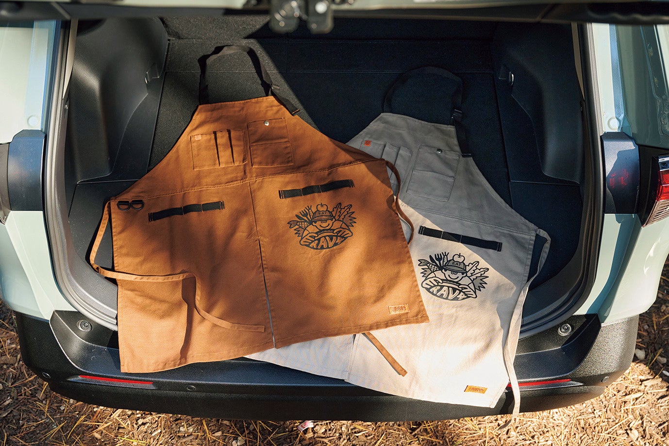 収納力抜群のエプロンは難燃素材のため焚き火料理も安心。各9,900円(税込)
