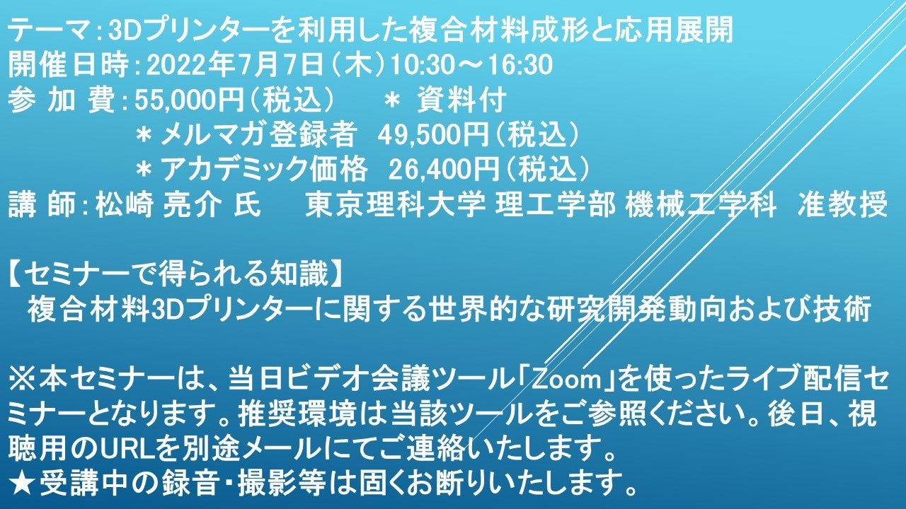 先端技術情報や市場情報を提供している(株)シーエムシー・リサーチ(千代田区神田錦町: https://cmcre.com/ )では、 各種材料・化学品などの市場動向・技術動向のセミナーや書籍発行を行っておりますが、 このたび「3Dプリンターを利用した複合材料成形と応用展開」と題するセミナーを、 講師に松崎 亮介 氏 東京理科大学 理工学部 機械工学科 准教授)をお迎えし、2022年7月7日(木)10:30より、 ZOOMを利用したライブ配信で開催いたします。 受講料は、 一般:55,000円(税込)、 弊社メルマガ会員:49,500円(税込)、 アカデミック価格は26,400円(税込)となっております(資料付)。