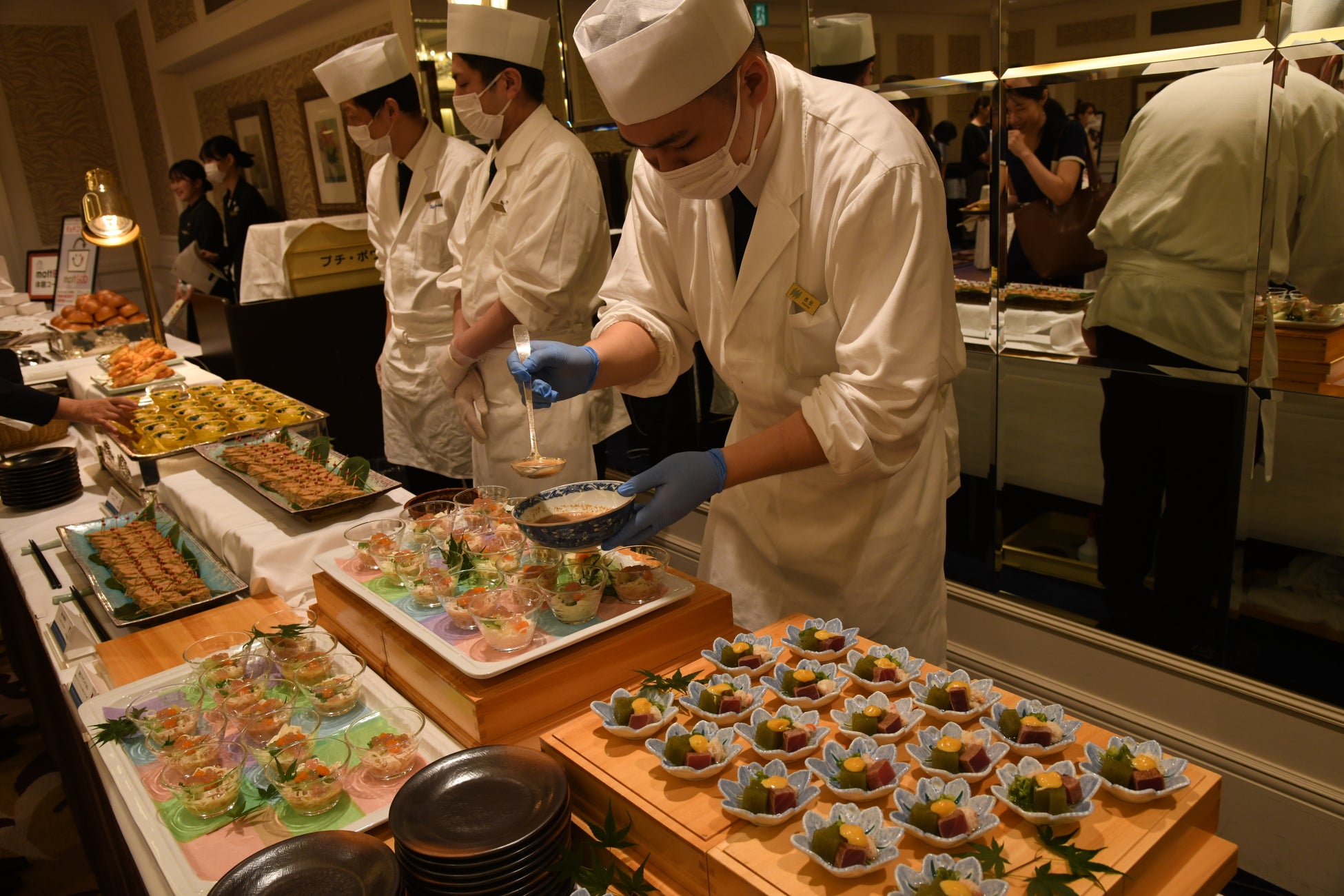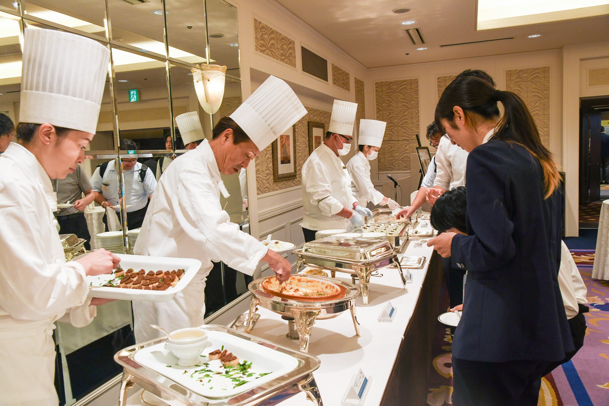 【試食コーナー】 もったいないメニュー(食品ロス削減を心がけて調理した料理) ・蒸し鶏の昆布バルサミコソース (ふぐの昆布締めにて使用した昆布でだしを取った後の昆布を使用) ・牛すじのゼリー寄せ (牛すじと鶏のコンフィの肉を外した後の骨で取ったブイヨン使用) ・帆立貝柱のソテ 糠のクルートかぶせ焼き (へしこに漬け込んだ糠を使用) ・アッシパルマンティエ (成型したときの端材牛肉を使用) ・豚バラ肉で巻いたバナナの皮の甘辛チーズ焼き (バナナの皮使用) ・昆布寒天の酢味噌かけ (だしを取った後の昆布使用) ・豆乳ご飯の春巻き (とうもろこしの芯で取っただしを使用) ・刺身のキャベツ巻き (刺身の端材を使用) ・鮪の松風焼き (まぐろの筋・まぐろの剥き身使用) ・海老ゴマダレそうめん (野菜のヘタのペーストと甘海老の頭で取っただし使用) ・ショコラのムース (テイクアウトで販売している焼き菓子の端材使用) ・バニラ風味のリオレ マンゴーパッションソース (ブッフェレストランで余ったライス使用) ・パンプディング (宴会会食と婚礼で出しているお代わり用のパンを使用) ・ラスクショコラ (宴会会食と婚礼で出しているお代わり用のパンを使用) |