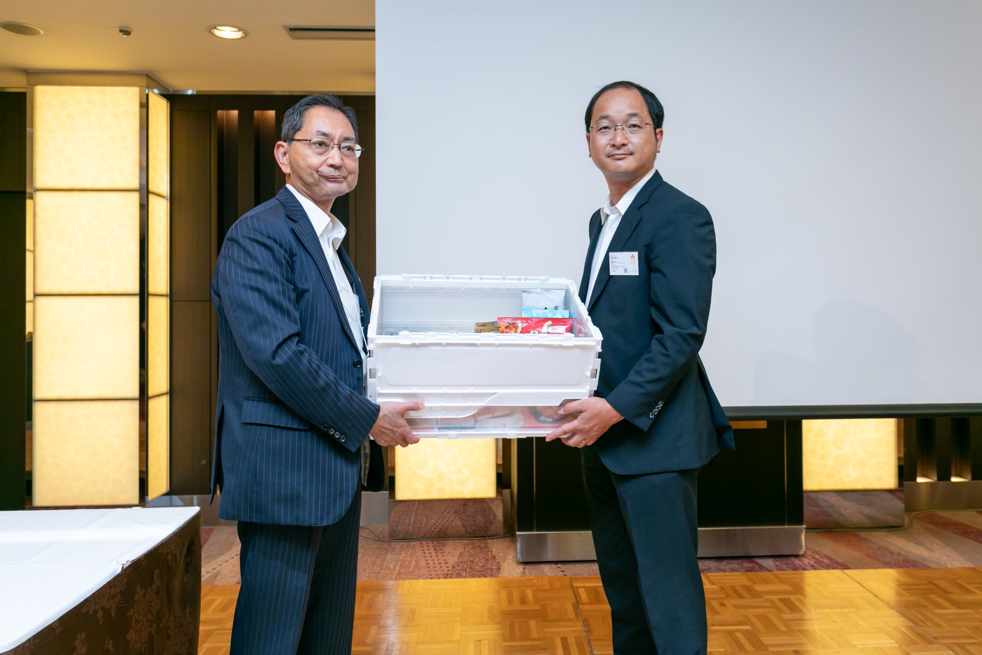フードドライブ寄贈式 認定NPO法人 セカンドハーベスト・ジャパンCEO 芝田 雄司 氏 mottECO FESTA 2025 実行委員長 松田 秀明 |