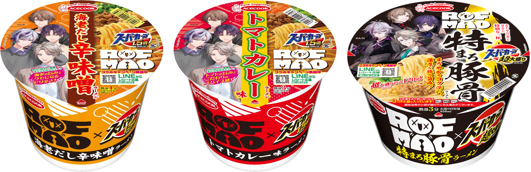 若者を中心に絶大な人気を誇るVTuberユニット『ROF-MAO』と「スーパーカップ」とのコラボ第2弾。ROF-MAOメンバー考案の味わいがカップめんになって登場します。