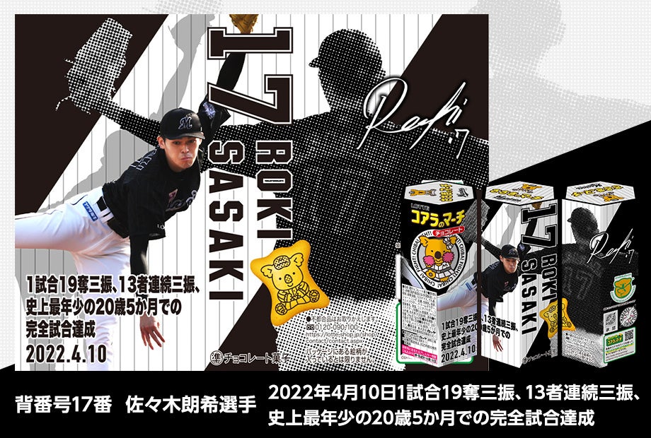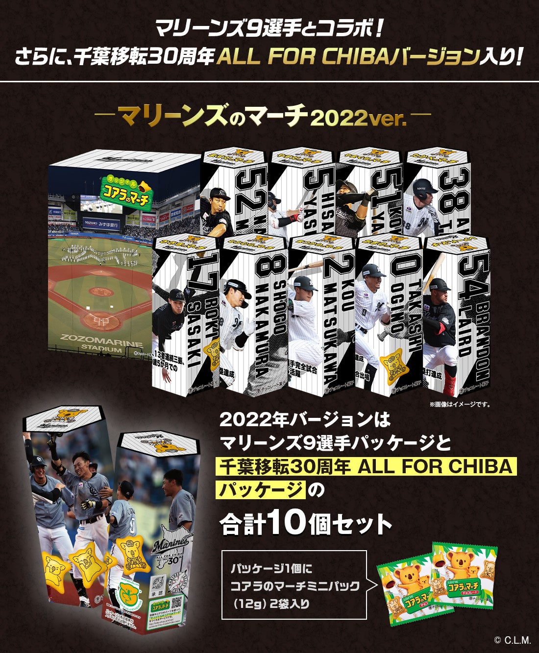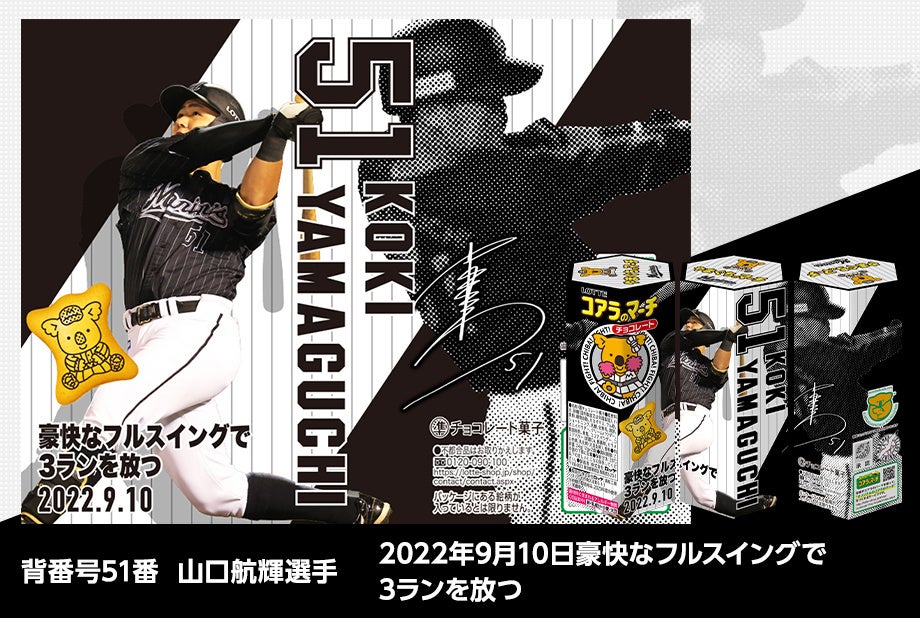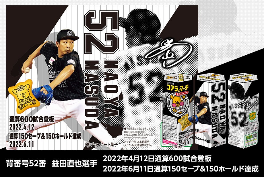 株式会社ロッテは11月18日(金)10時より、毎年恒例となった『マリーンズのマーチ2022ver.』をロッテグループ公式オンラインモール(https://lotte-shop.jp/shop/e/eLmkoala202212/)限定で発売いたします。コアラのマーチと千葉ロッテマリーンズがタイアップし、今シーズン活躍した選手達の記録達成や名シーンを集めた躍動感あふれる10種類のデザインで登場します。2022年度ホーム開幕戦オープニングセレモニーをベースにした特別デザインのBOXに入れてお届けします。マリーンズのマーチ2022Ver.は3,000セット限定となっております。ぜひお買い求めください。
