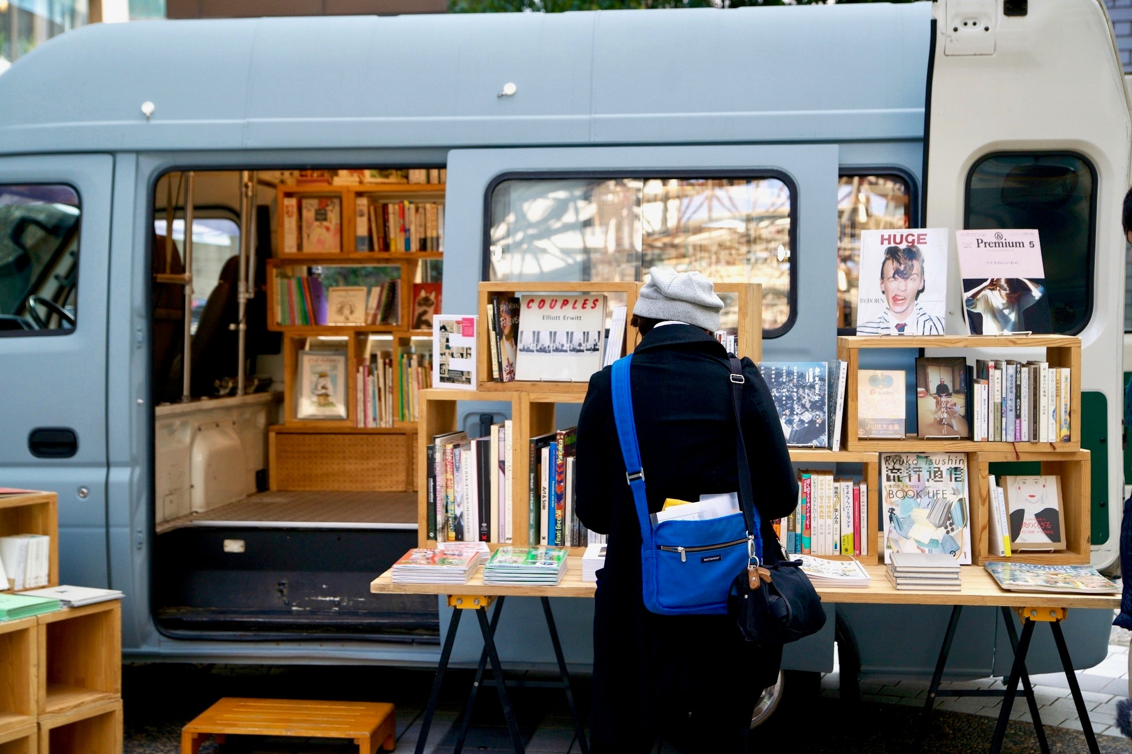 BOOK TRUCKは公園や駅前、野外イベントなどの行く先々に合わせて、その都度品揃えや形態が変わるフレキシブルな移動本屋です。新刊書、古書、洋書、リトルプレス、雑貨などを販売しています。