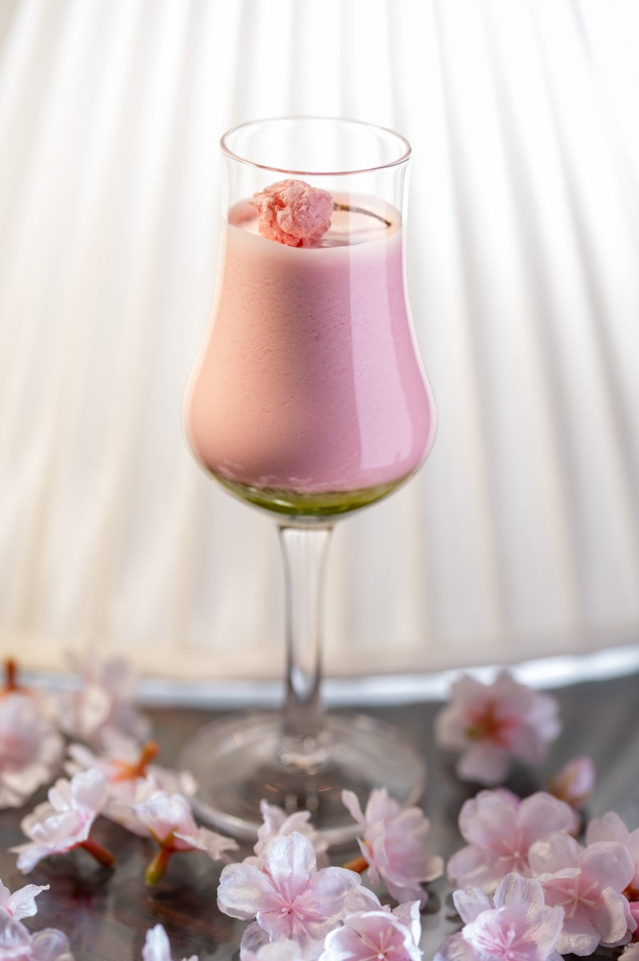 満開の桜と鶯を思わせるグラデーションカクテル。
