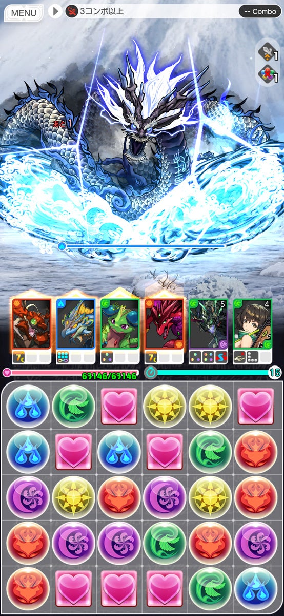 世界各地のさまざまなダンジョンで、同じ色のドロップを縦か横に3つ以上揃えて消すパズルで、待ち受ける敵に挑みます。ドロップを消すと、味方のモンスターが敵を攻撃。一度に複数のドロップを消すとコンボになり、より強力な攻撃を敵に与えることができます。うまくドロップを動かし、大ダメージを狙ってダンジョンクリアを目指します。ダンジョンをクリアすると、敵がドロップしたマナやクリスタルが手に入ります。