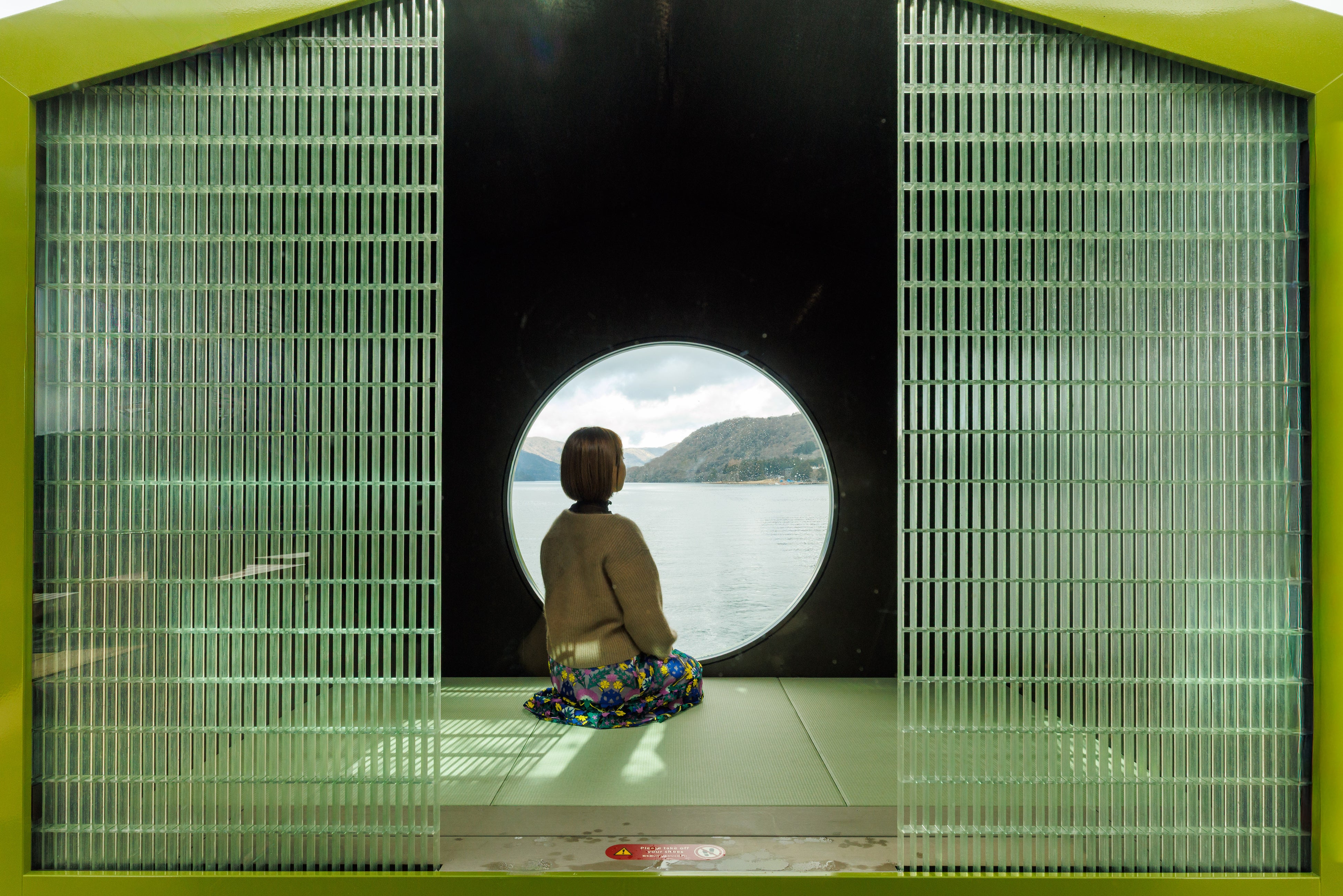 「箱根遊船 大茶会」船内の窓が綾鷹デザインにラッピングされ、和モダンな水上空間をテーマにした「綾鷹」と「船旅」をモチーフにしたデザインが施されます。