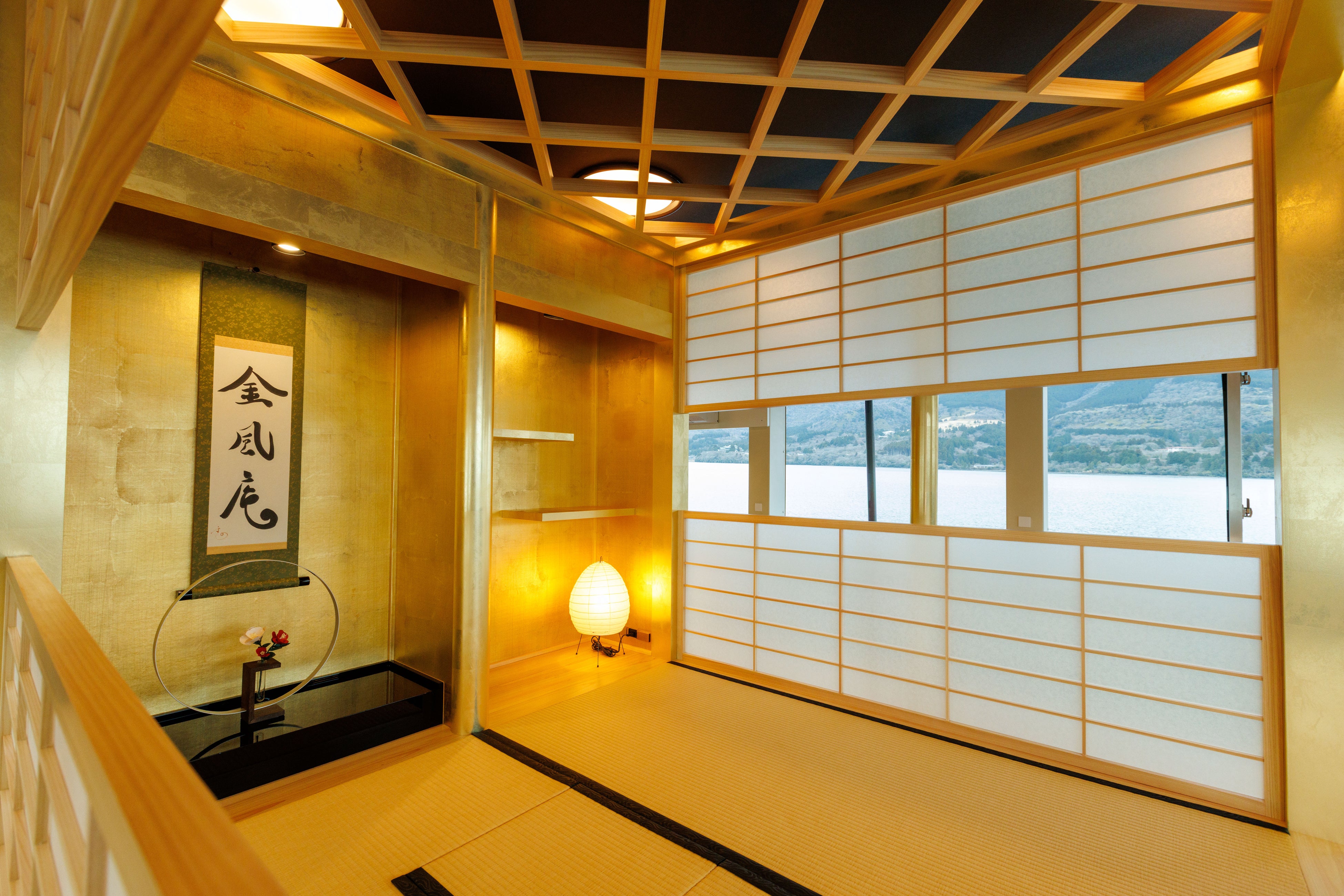 「箱根遊船 大茶会(だいちゃかい)」は、2025年12月に箱根・芦ノ湖に誕生した、お茶をテーマにした観光遊覧船です。船内には黄金に煌めく茶室をイメージした畳席「茶室 金風庵」や、茶畑を開放的な屋外ベンチ「茶畑だんだん」、丸窓から景色を眺められる「茶室 緑風庵」など、ユニークな居場所が多数揃っています。また、「茶店」では抹茶を使ったドリンクやスイーツも提供し、これまでにない湖上体験をお楽しみいただけます。