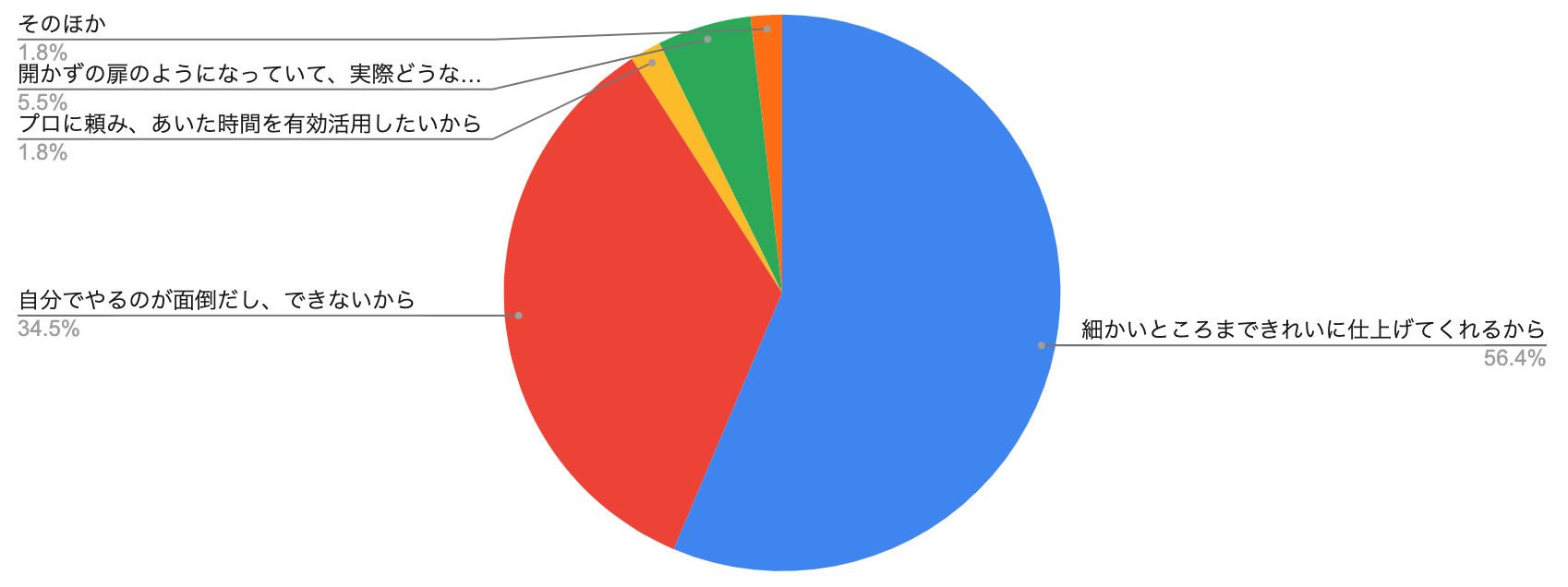 特に多かったのが「お金がかかる」、「業者の方に家に入って欲しくない」というふたつの理由。掃除にお金をかけたくないのは「やろうと思えば自分で掃除できる」と思っている人がほとんど。