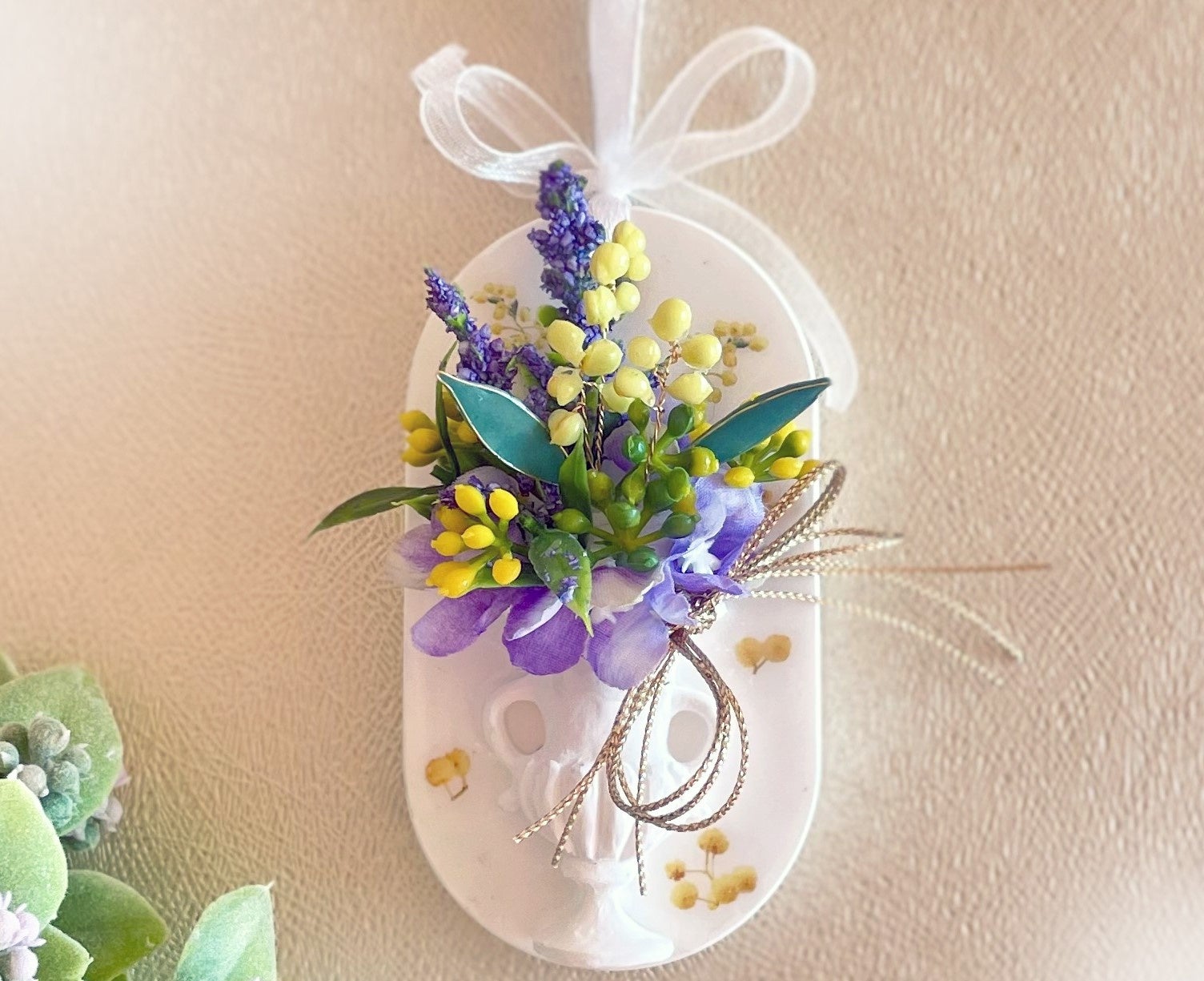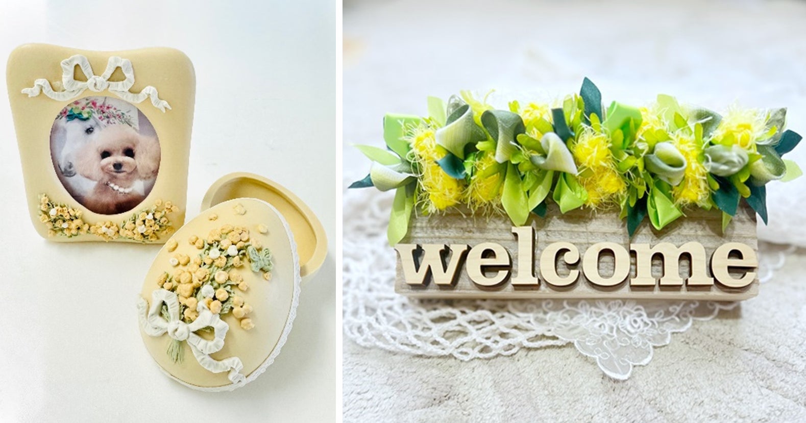 今年初登場の西洋陶芸「ポーセレンクラフト」では、ミモザの写真立てとイースターエッグボックスの2種類の作品をお作りいただけます。また、同じく初登場の「リボンレイワークショップ」では、ミモザをイメージした明るいイエローのウエルカムスタンドで華やかな空間を演出。そのほか、フラワーアレンジメントでは、刺しゅう枠を使用するアレンジや、レジンで作るミモザのアロマストーンなど珍しいデザインをご用意しています。