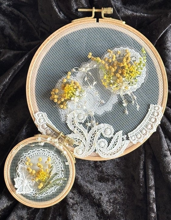 「ミモザのドライフラワーアレンジ ~刺しゅう枠とレースで華やかに~」
