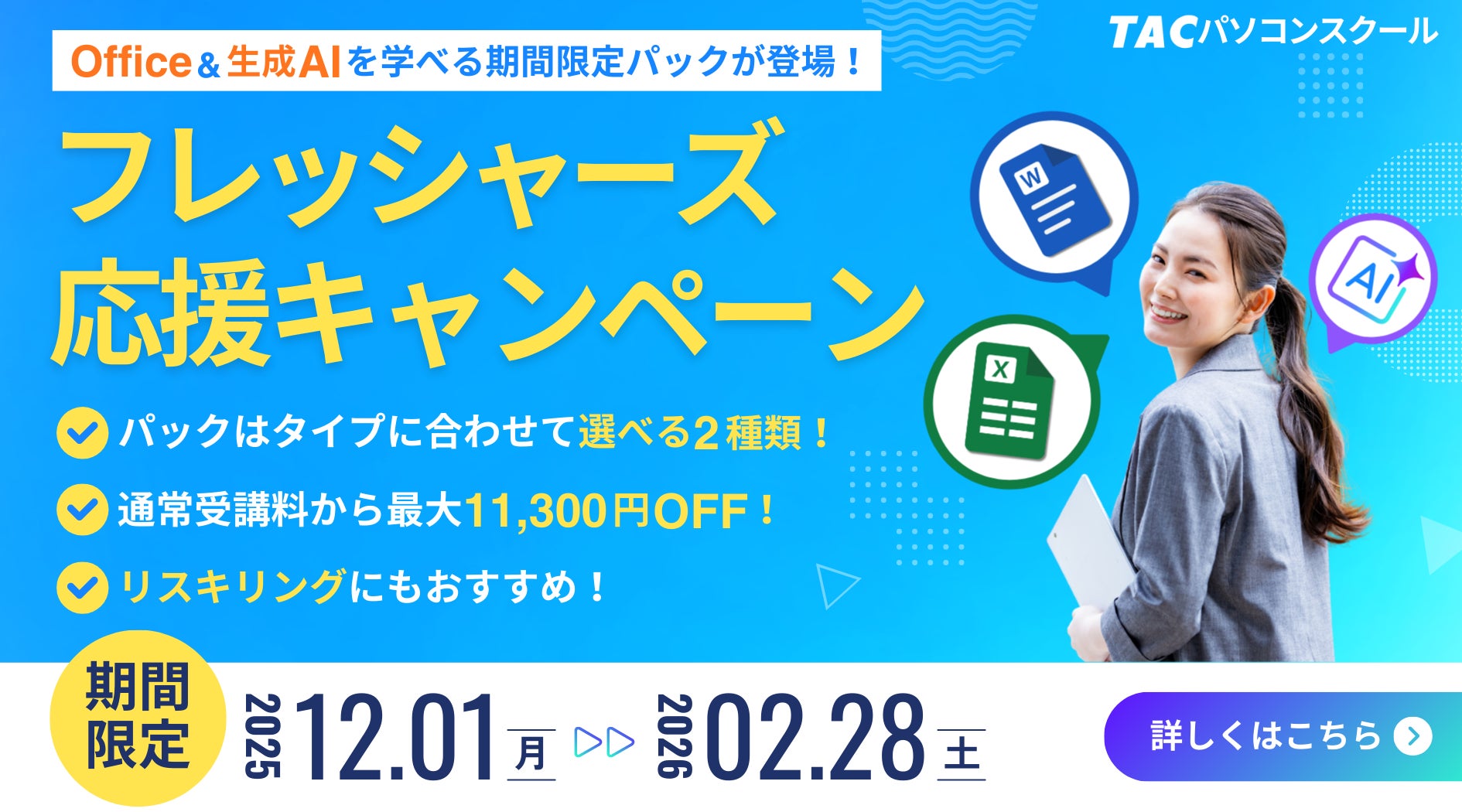 TACパソコンスクールでは、2026年1月15日(木)より「Microsoft 365 Copilot活用 Web通信コース」を開講いたします。AIによる業務支援が当たり前となる時代において、業務効率を飛躍的に高め、より価値ある仕事に集中できる「新しい働き方」の実現をサポートします。