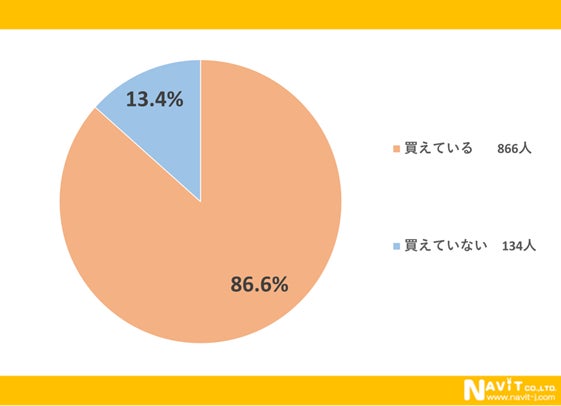 スーパーなどでお米を買うことが難しくなっている昨今ですが、お米を買えていますか?というアンケートに対して、「買えている」と回答された人が86.6%で、「買えていない」と回答された人が13.4%という結果になりました。大部分の人はお米を買うことができているようです。