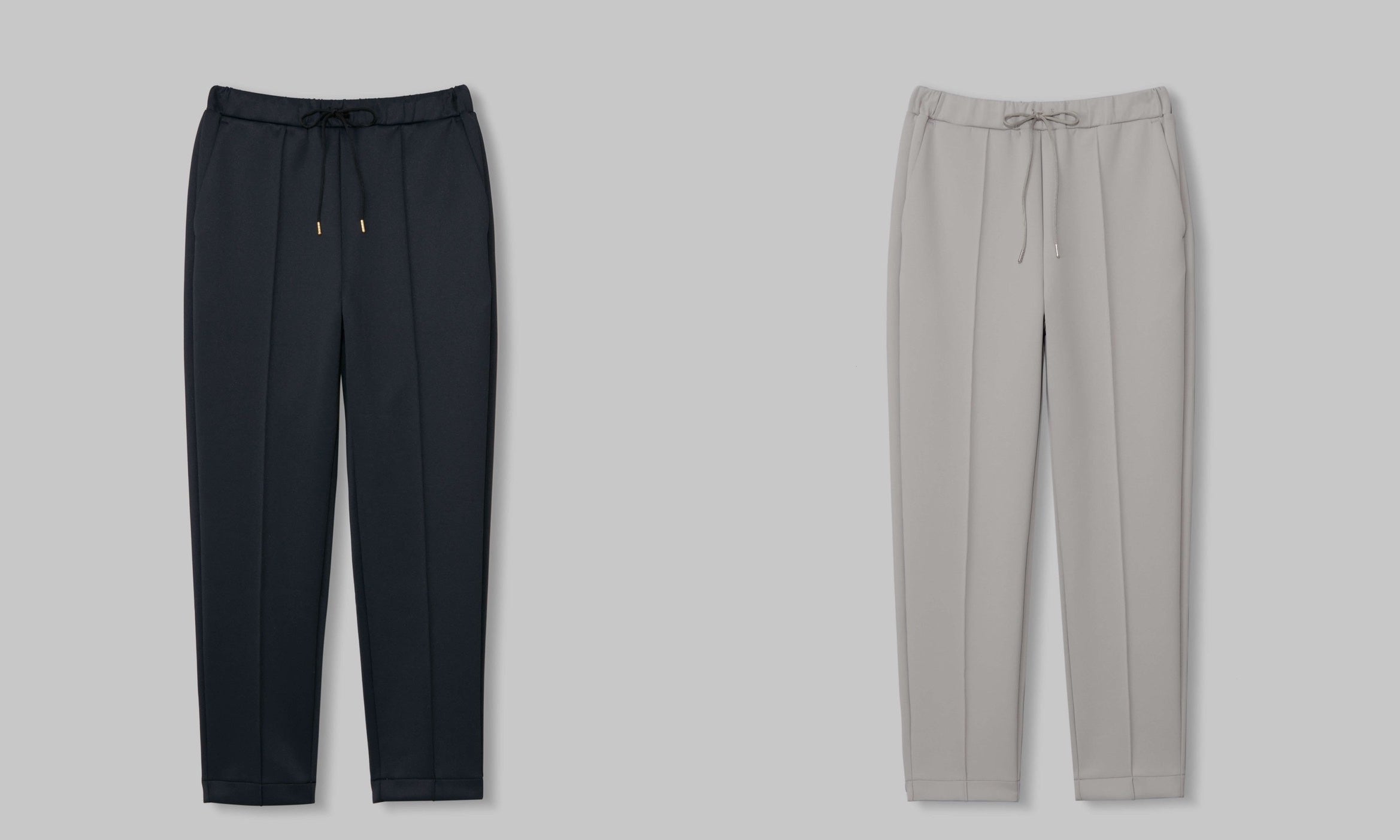 パンツは、キックバック性も抜群で着心地はとても楽なのに、センタープレスとややテーパードのすっきりしたシルエットで脚をきれいに見せてくれます。ウエストはゴムで締め付けることなく身体に寄り添い、やや高めに設定したウエストは脚を長く、ヒップ位置を高く見せてくれます。ウエストに通る紐先にはさりげないアクセントになる金具が付いています。トップスとパンツはセットアップで着用可能です。