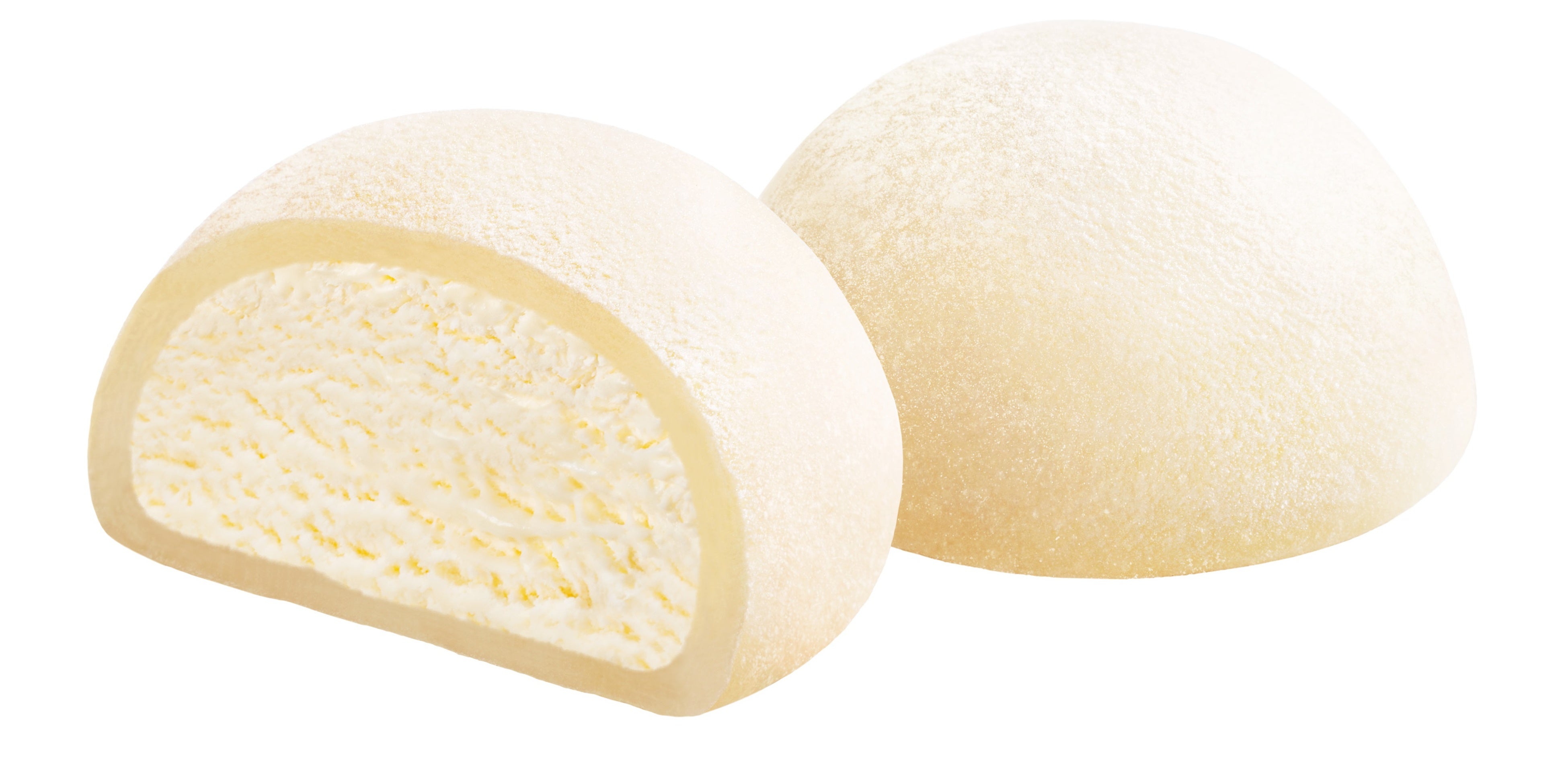 - いつもよりおもちを増量した弾むぷにぷに食感を楽しめる厚もちでコクのあるバニラアイスを包みました。