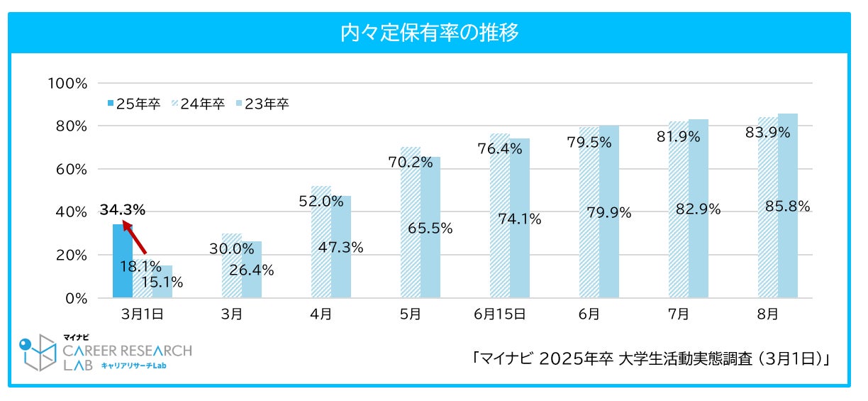 ◆2025年卒業予定の大学生・大学院生の内々定率は、前年比16.2pt増の34.3%