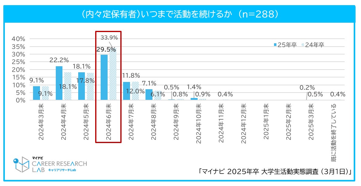 内々定を保有したまま活動を継続する学生は71.6%(前年比6.2pt減)だった。また、就職活動を継続する学生にいつまで活動するかを聞いたところ、「2024年6月末」との回答が29.5%(前年比4.4pt減)となり、継続する学生が大半だということがわかる。【図3、4】