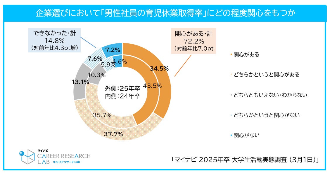 2023年4月より、従業員規模1,000人以上の企業に対して男性社員の育児休業取得率等の公表が義務化されたが、さらに2025年4月からはその対象が従業員規模100人以上に拡大される方針で検討されている。「男性育児休業取得率」について、企業選びの際にどの程度関心があるか聞くと、「関心がある」が72.7%となった。前年の調査は義務化されたタイミングだったこともあり、25年卒の数値は前年に比べるとやや低下しているが、依然として関心は高いようだ。次の改正では、さらに注目度が高まると予想される。【図7】