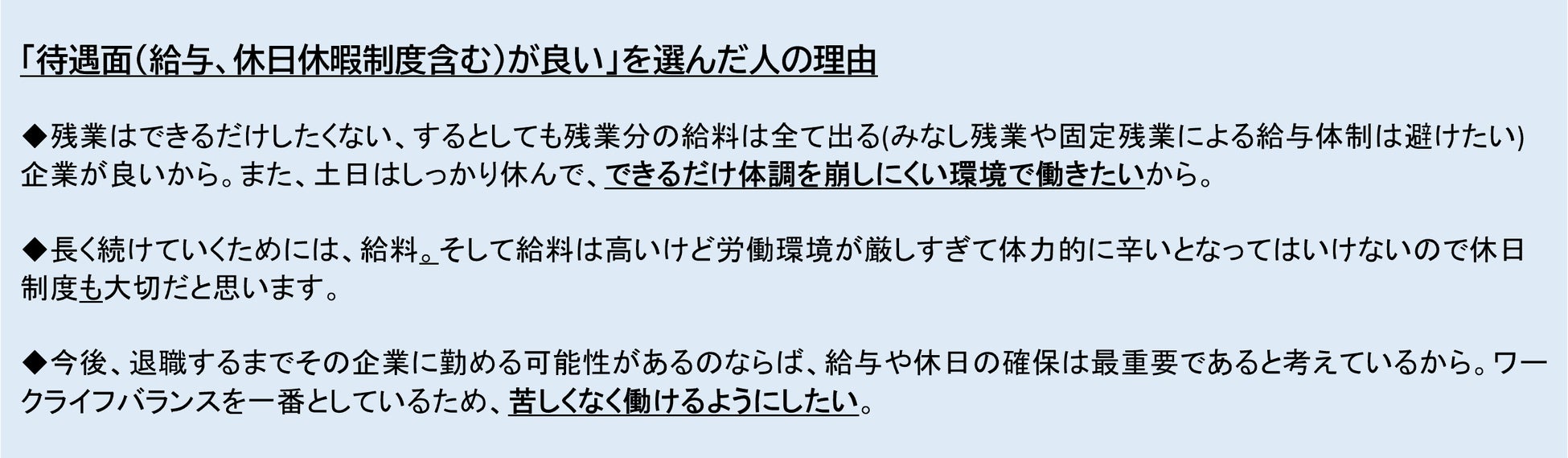 就職先として企業を選ぶ際のポイントとして、最も当てはまるものは「待遇面が良い」が22.8%(前年比4.5pt増)で最多だった。昨年最も多かった「社風や働く社員が良い・良さそう」は2番目で22.6%(前年比6.1pt減)となった。上位2項目についてはほぼ同じ割合であり、待遇の良さと社風の良さの両方が企業を選ぶうえで特に重要なポイントとなるようだ。また「待遇面の良さ」を選んだ理由としては、長く勤めたり、よい仕事をするために「心身の健康の必要性」に言及する声が見られた。【図5、6】