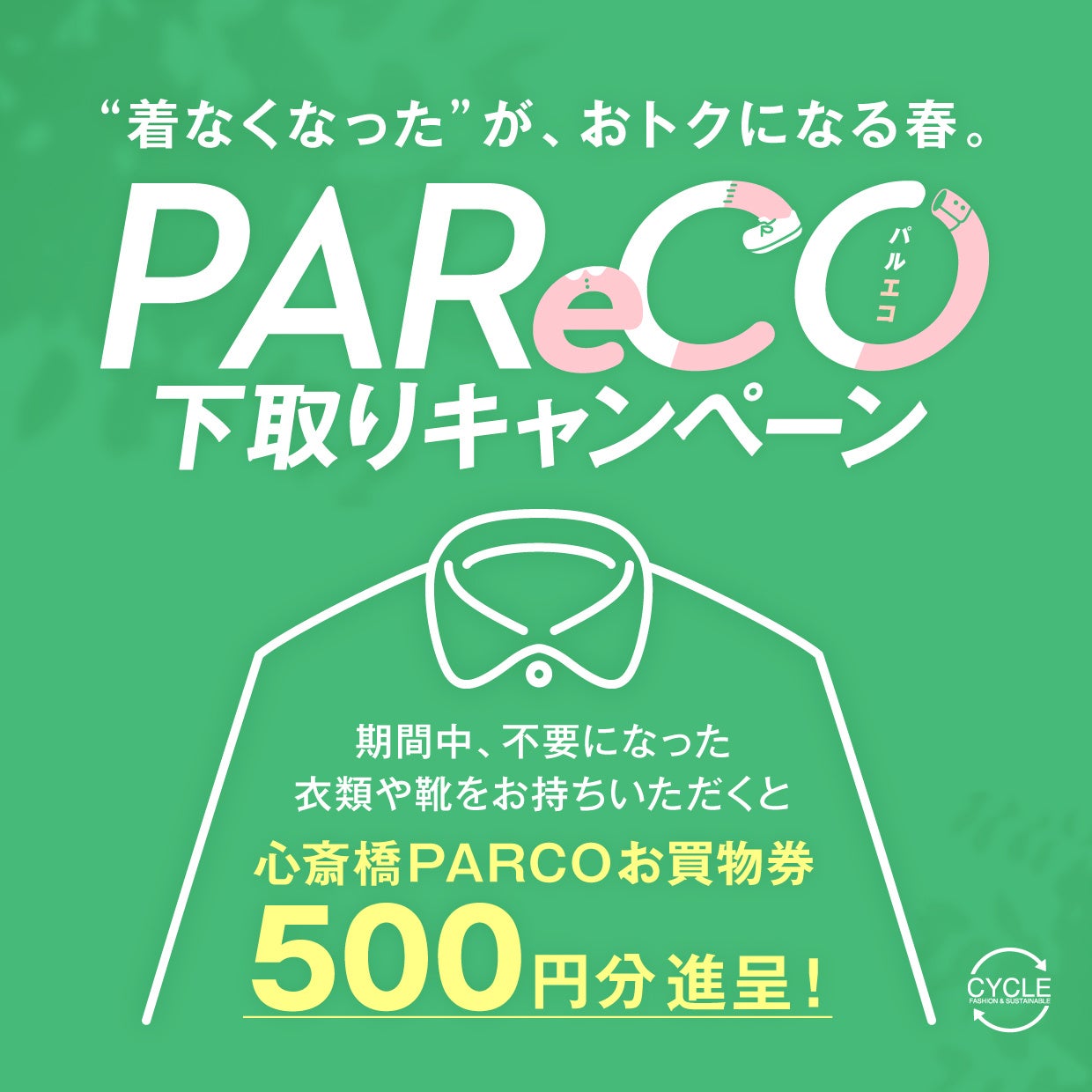 ■内容:期間中、不要になった衣類や靴をお持ちいただくと心斎橋PARCOお買物券500円分をプレゼント!