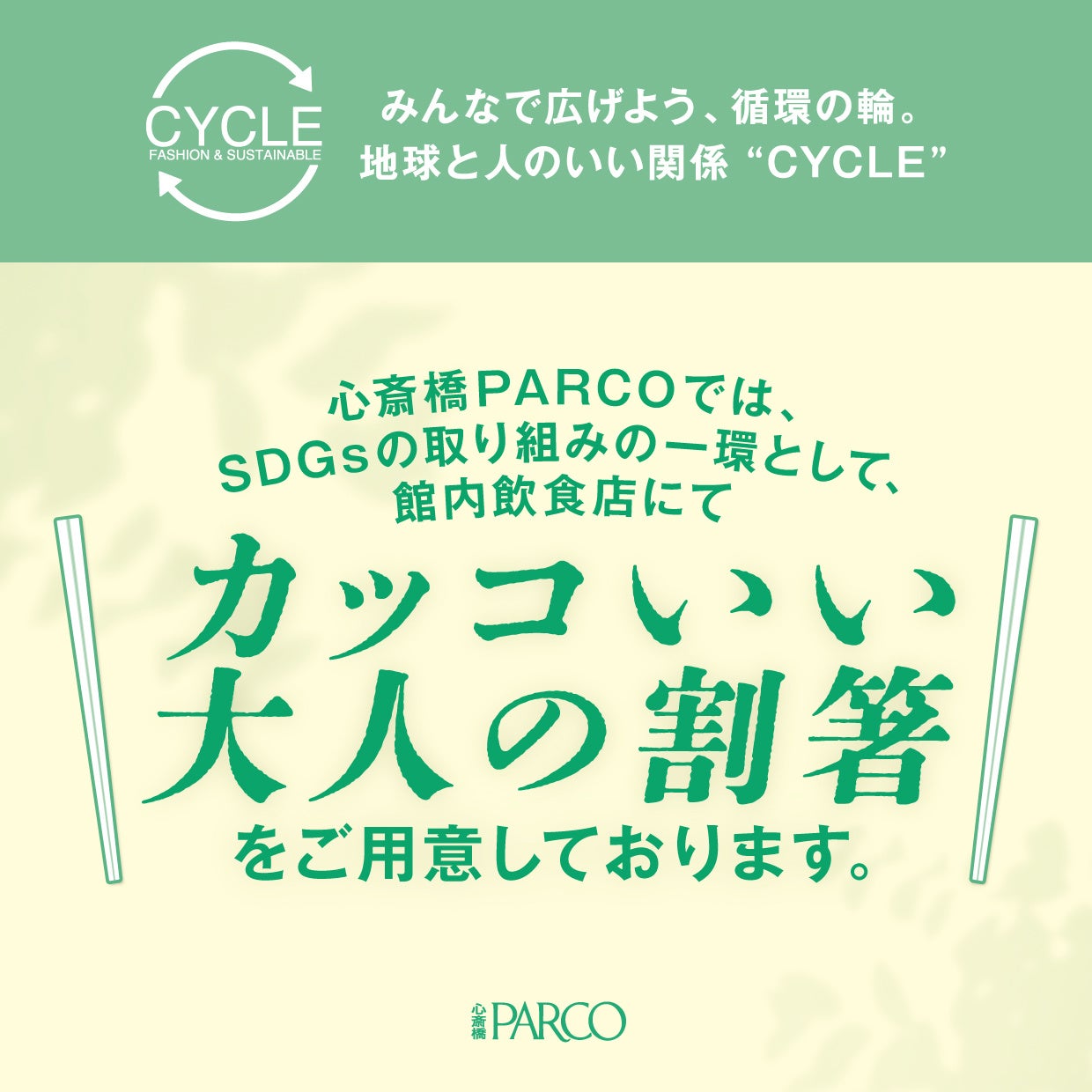 ※本プロジェクトは本来お客様に割箸をご購入頂くのですが、心斎橋PARCOでは館内でのご飲食を通して「カッコいい大人の割箸プロジェクト」を知って頂き、SDGsを意識して頂くきっかけとなるように割箸は心斎橋PARCOにて購入いたします。