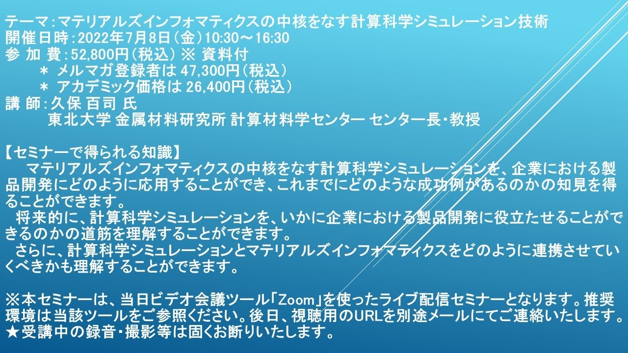 先端技術情報や市場情報を提供している(株)シーエムシー・リサーチ(千代田区神田錦町: https://cmcre.com/ )では、 各種材料・化学品などの市場動向・技術動向のセミナーや書籍発行を行っておりますが、 このたび「マテリアルズインフォマティクスの中核をなす計算科学シミュレーション技術」と題するセミナーを、 講師に久保 百司 氏 東北大学 金属材料研究所 計算材料学センター センター長・教授)をお迎えし、2022年7月8日(金)10:30より、 ZOOMを利用したライブ配信で開催いたします。 受講料は、 一般:52,800円(税込)、 弊社メルマガ会員:47,300円(税込)、 アカデミック価格は26,400円(税込)となっております(資料付)。