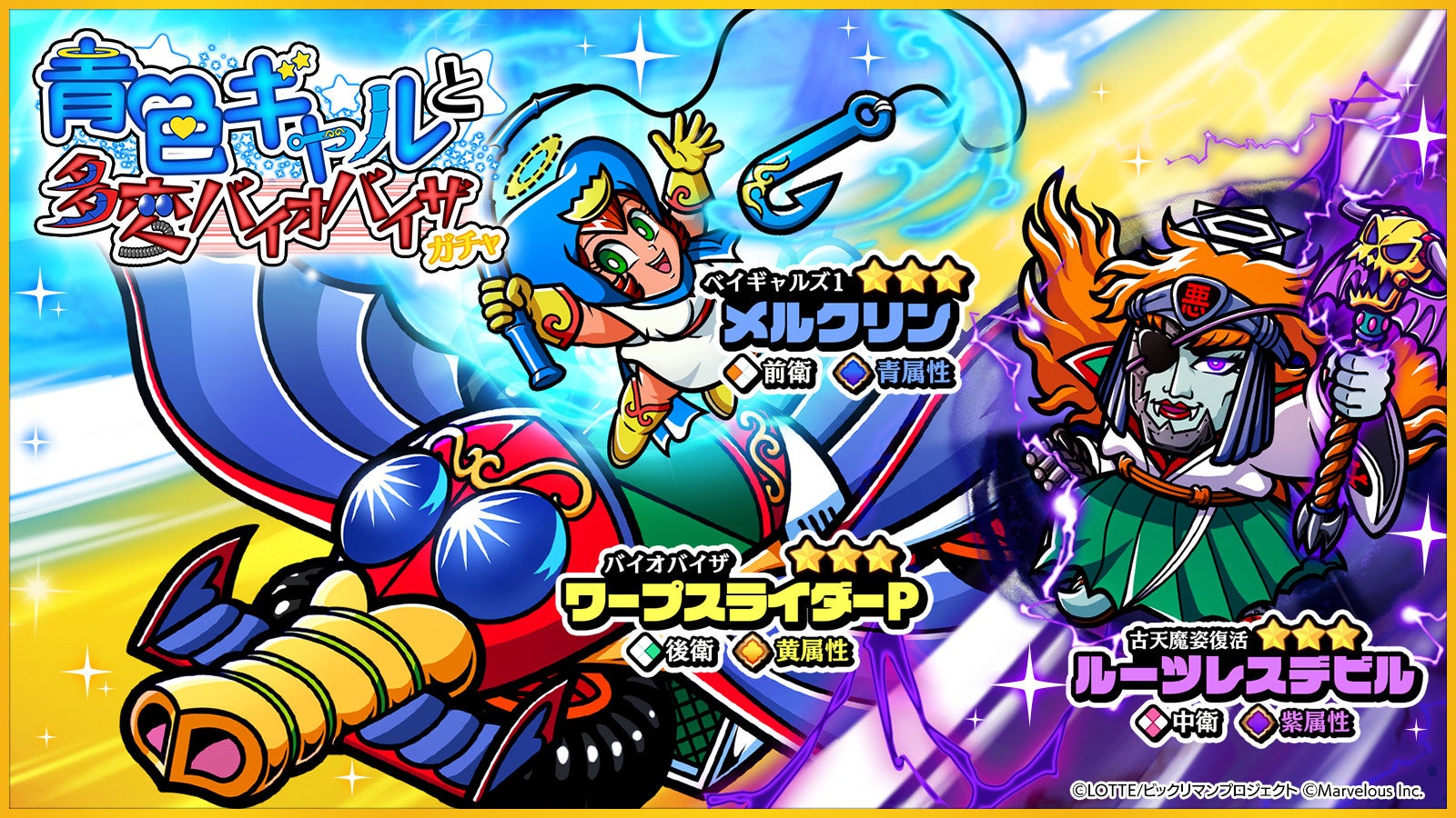 新たな☆3キャラクター[ベイギャルズ1]メルクリン、[バイオバイザ]ワープスライダーP、[古天魔姿復活]ルーツレスデビルが登場する、「青色ギャルと多変バイオバイザガチャ」を開始いたしました。