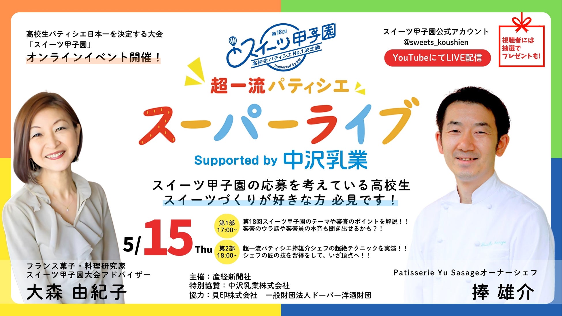 「第18回スイーツ甲子園 高校生パティシエNo.1決定戦」(主催:産経新聞社、特別協賛:貝印)のオンラインイベント「スイーツ甲子園 超一流パティシエ スーパーライブ Supported by 中沢乳業」を、5月15日(木)午後5時から開催し、オンライン配信します。【公式チャンネル】 https://youtube.com/@sweets_koushien