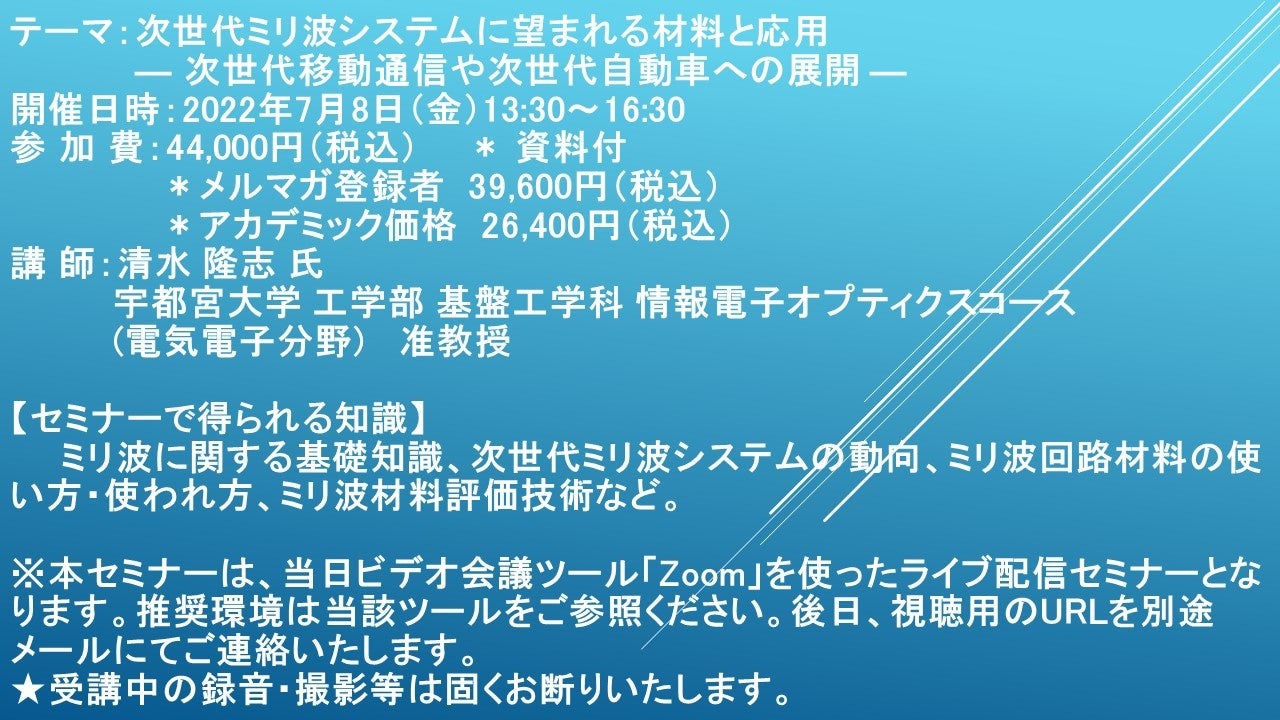 先端技術情報や市場情報を提供している(株)シーエムシー・リサーチ(千代田区神田錦町: https://cmcre.com/ )では、 各種材料・化学品などの市場動向・技術動向のセミナーや書籍発行を行っておりますが、 このたび「次世代ミリ波システムに望まれる材料と応用」と題するセミナーを、 講師に清水 隆志 氏 宇都宮大学 工学部 基盤工学科 情報電子オプティクスコース(電気電子分野) 准教授)をお迎えし、2022年7月8日(金)13:30より、 ZOOMを利用したライブ配信で開催いたします。 受講料は、 一般:44,000円(税込)、 弊社メルマガ会員:39,600円(税込)、 アカデミック価格は26,400円(税込)となっております(資料付)。
