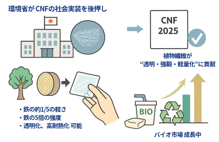 環境省はCNFを「省CO₂実現のための革新的素材」と位置づけ、実装・量産化を支援する制度を展開しています。また2025年には、産総研×NEDOによる『セルロースナノファイバーの安全性評価書2025』が公開され、吸入・経皮・水生生物への影響など安全性データが整理され、企業が採用しやすい環境が一気に整いつつあります。