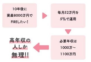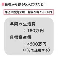年収350万円、生活費の月額15万円の会社員がFIREを目指す場合。毎月5万円を投資にまわすと、目標資産額4500万円に到達するまでに32年間かかります。