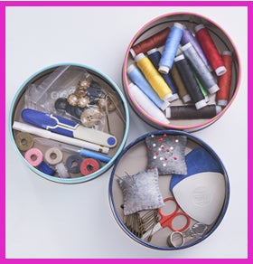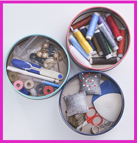 世界中のラッキーチャームを型どった米粉クッキー入りおかき缶は全10種。嵩張るソーイング類をジャンルわけして整理整頓保存。