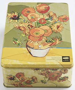 1番人気ゴッホのひまわりのビッグサイズ缶。食品類でもかさばるレトルト類の保存にこの大きさと深さを活用。