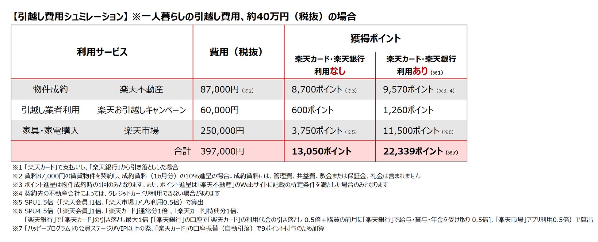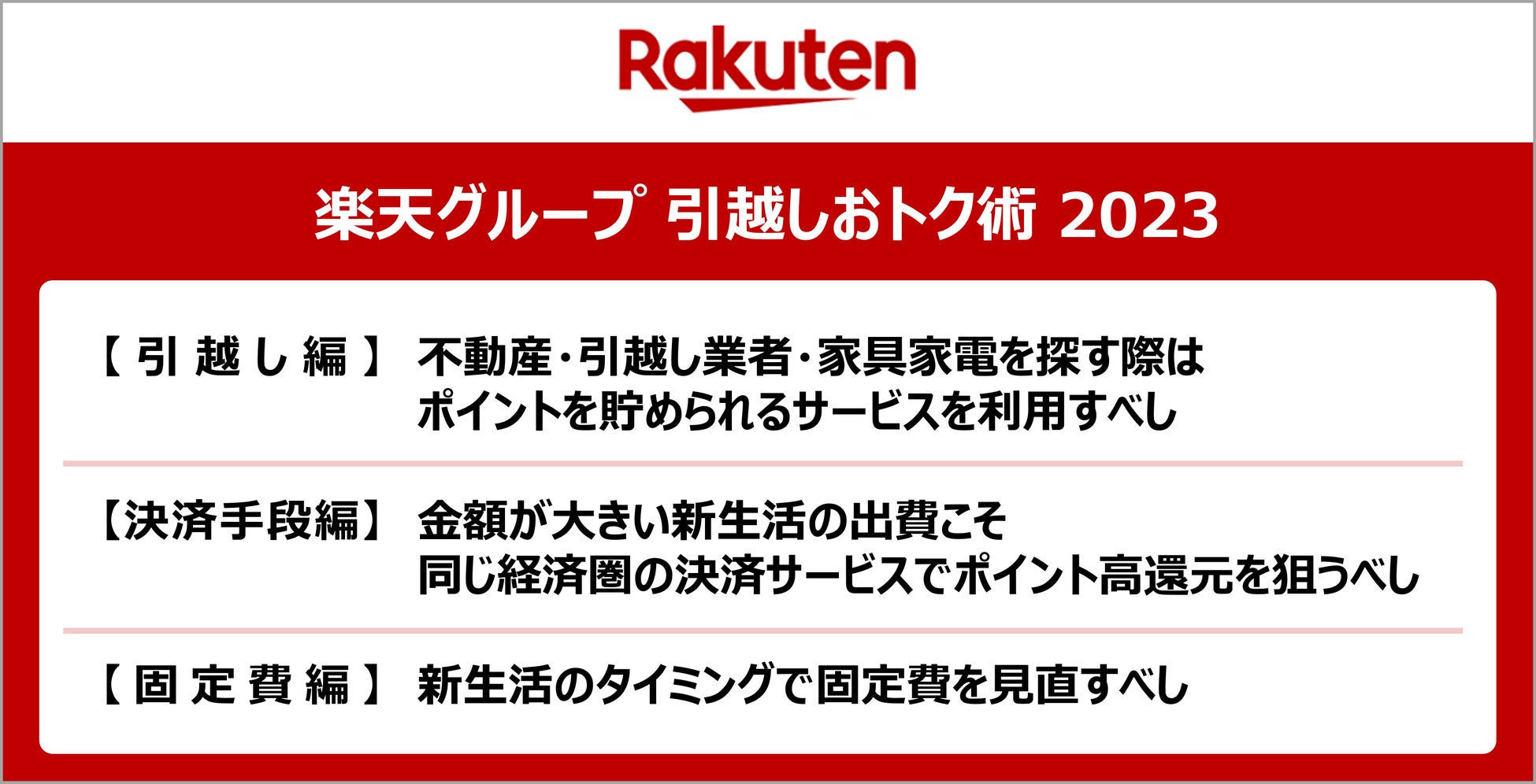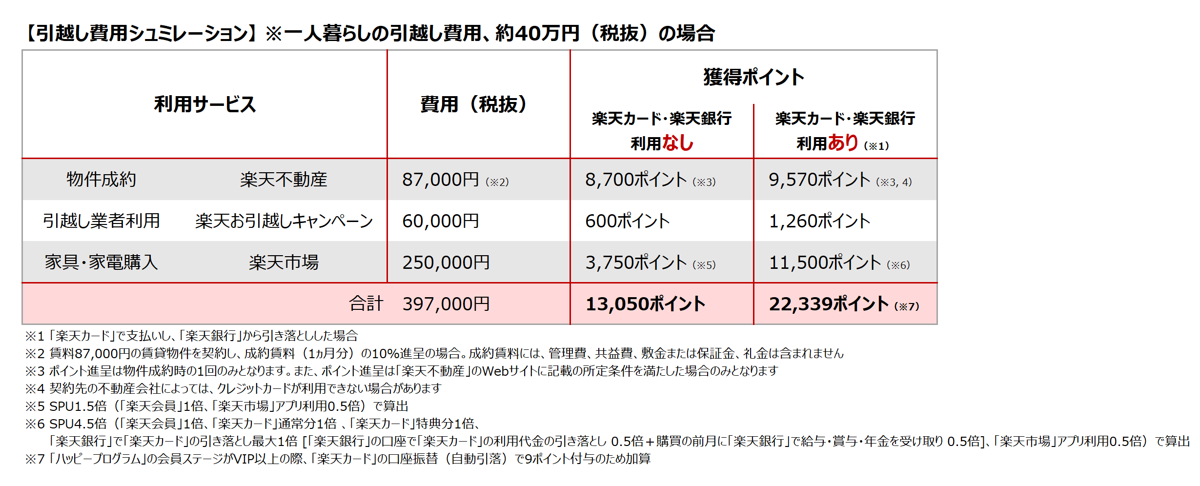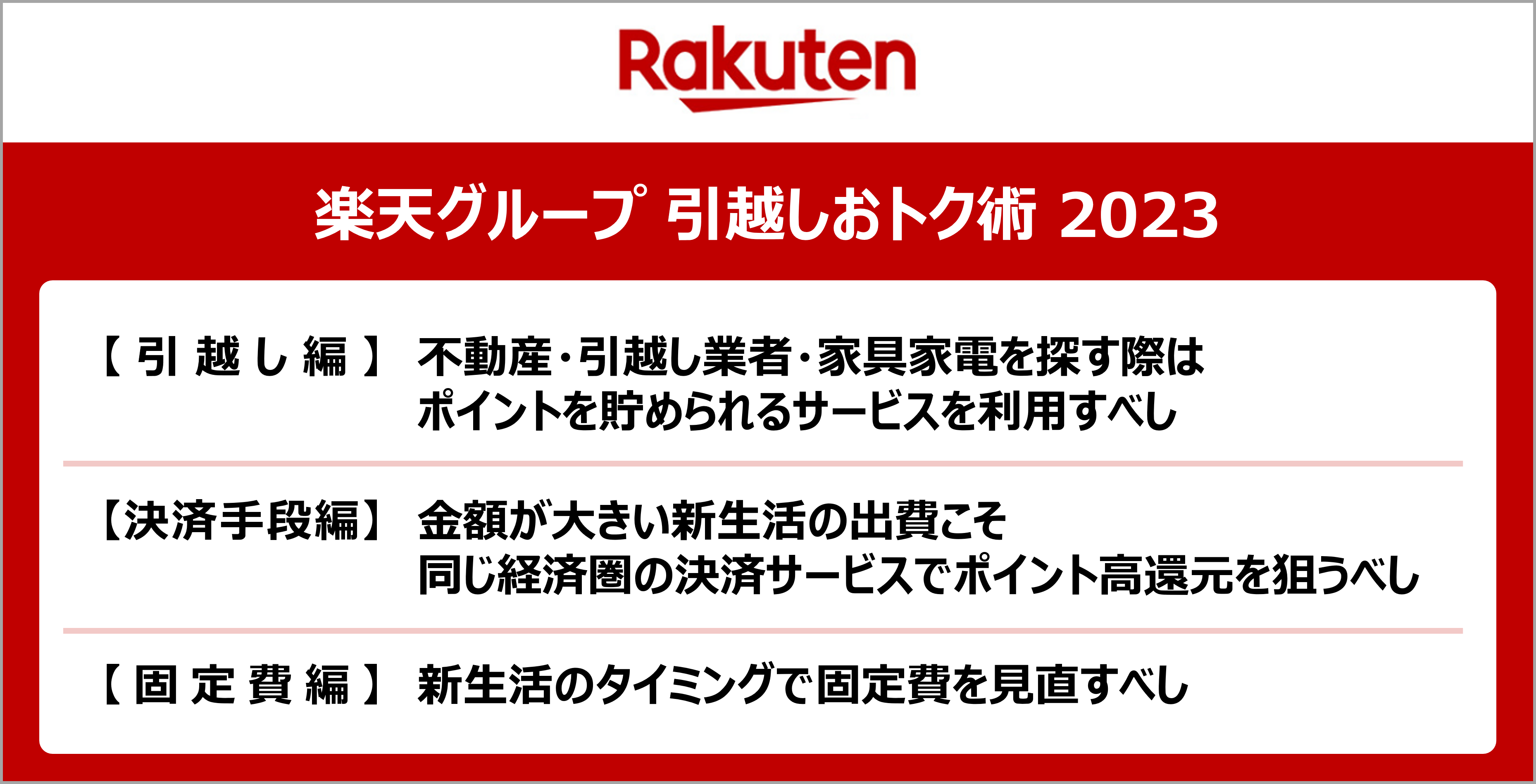 新生活シーズンに高まるのが引越し需要ですが、2023年は燃料高騰や物価高騰などの影響を受け、引越し費用や家具・家電の購入費用などの引越し費用が値上げ傾向にあります。そんな引越し費用も楽天経済圏での各サービスの活用やポイ活で、「楽天ポイント」を貯められておトクに工夫することが可能です。例えば一人暮らしの引越し費用が約40万円(税抜)だった場合、全国のマンション・一戸建て・土地・賃貸物件情報等を提供する不動産サイト「楽天不動産」や「楽天市場」など楽天のサービスを活用することで、約2万ポイント以上をもらうことができます。新生活シーズンを少しでもおトクに迎えられるよう、楽天の各サービスの活用術を【引越し編】【決済手段編】【固定費編】に分けて紹介します。
