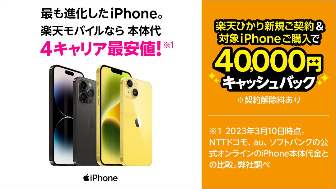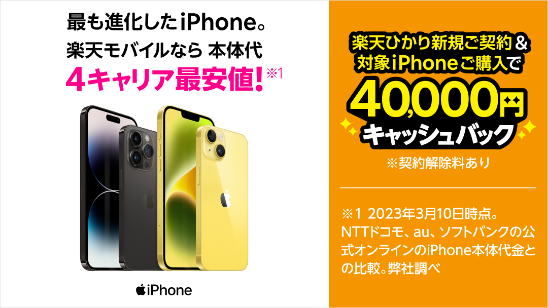 「楽天ひかり」を新規ご契約かつ対象の「iPhone」をご購入のお客様に、40,000円(税込)をキャッシュバックします。
