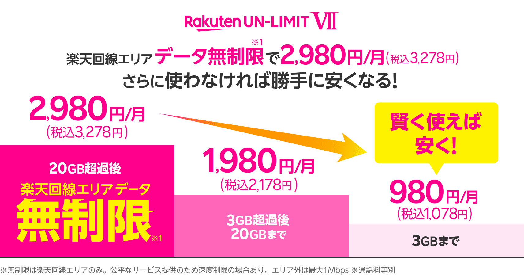 「楽天モバイル」が提供するワンプラン「Rakuten UN-LIMIT VII」は段階制の料金プランとなっているので、使ったデータ量に合わせて自動的に料金が決まります。20GB以上はどれだけ使っても2,980円(税抜)で、3GB~20GBまでは1,980円(税抜)、3GBまでの場合は980円(税抜)でご利用いただけます。固定費を見直すタイミングにおすすめの料金設定です。