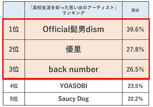 今年卒業する高校3年生の高校生活は2020年4月、まさにコロナ禍から始まりました。休校やリモート授業、学校でのマスク生活と、通常とは異なる様子で高校生活を過ごしてきた彼らに、「高校生活を彩った思い出のアーティスト」を聞くと、TOP3は1位「Official髭男dism」、2位「優里」、3位「back number」という結果に。